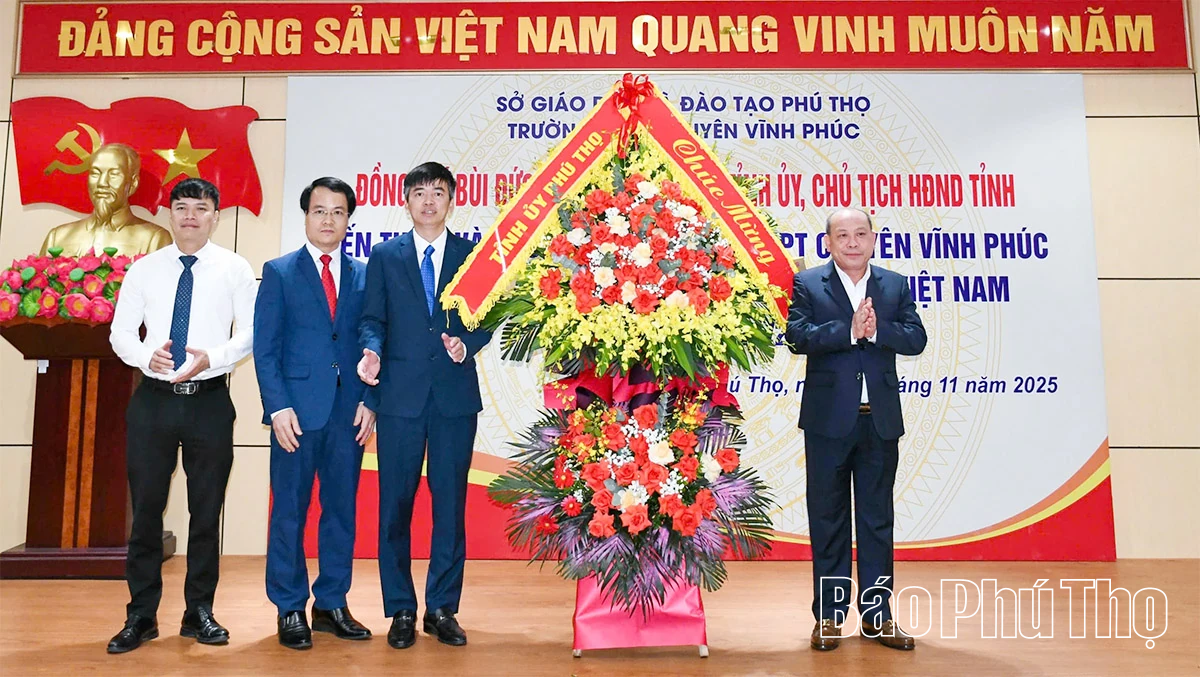 Đồng chí Bùi Đức Hinh - Phó Bí thư Tỉnh ủy, Chủ tịch HĐND tỉnh tặng hoa chúc mừng Trường THPT Chuyên Vĩnh Phúc