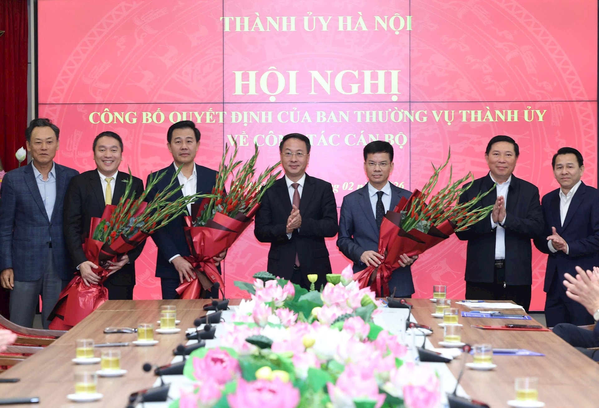 Phó Bí thư Thường trực Thành ủy Hà Nội Nguyễn Văn Phong; Trưởng ban Tổ chức Thành ủy Hà Minh Hải và Phó Chủ tịch UBND thành phố Nguyễn Mạnh Quyền trao quyết định và tặng hoa chúc mừng các đồng chí nhận nhiệm vụ mới. Ảnh: Viết Thành