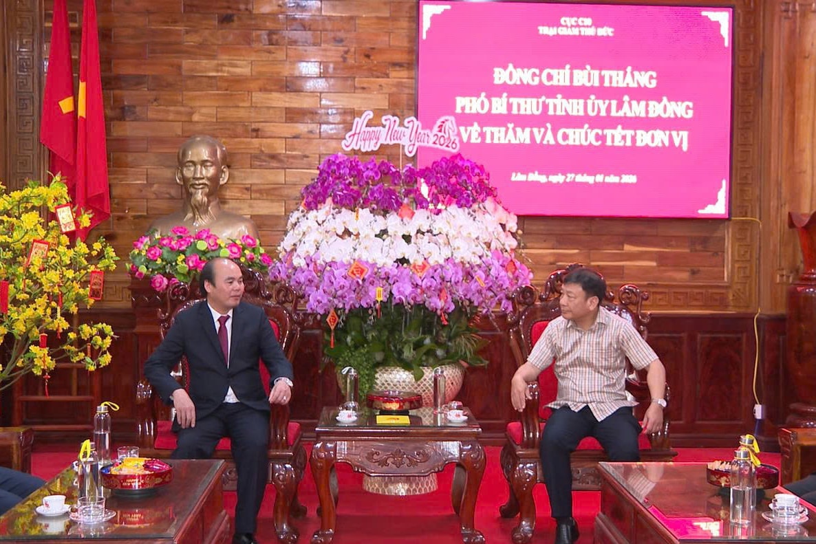 Trong không khí Tết Nguyên đán Bính Ngọ 2026 cận kề, thay mặt lãnh đạo tỉnh Lâm Đồng, đồng chí Phó Bí thư Tỉnh ủy Bùi Thắng gửi lời chúc đến toàn thể cán bộ, chiến sĩ Trại giam Thủ Đức đón năm mới an khang, mạnh khỏe, tiếp tục hoàn thành tốt nhiệm vụ được giao; đồng thời mong muốn sự phối hợp giữa đơn vị với cấp ủy, chính quyền địa phương ngày càng chặt chẽ, hiệu quả hơn trong thời gian tới.