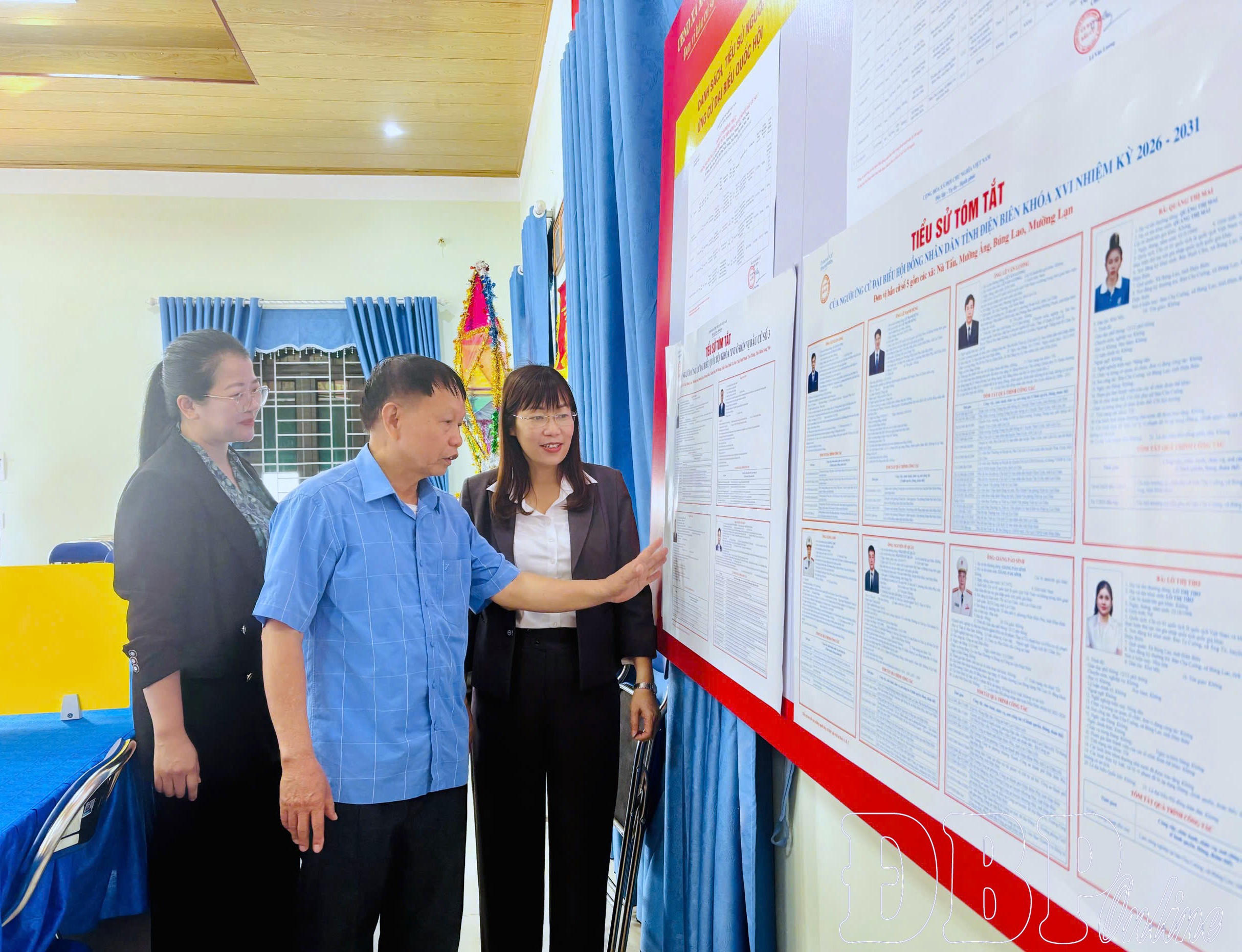 Đoàn đã trực tiếp kiểm tra công tác trang trí khánh tiết, bố trí thùng phiếu, khu vực bỏ phiếu, niêm yết danh sách ứng cử viên, danh sách cử tri và các điều kiện cơ sở vật chất phục vụ bầu cử một số khu vực bỏ phiếu tại xã Mường Ảng.
