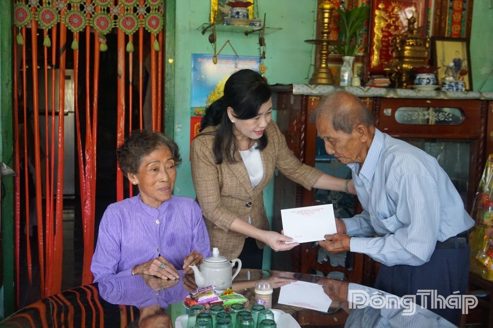 Đồng chí Châu Thị Mỹ Phương ân cần thăm hỏi sức khỏe và trao quà tết cho ông Võ Quang Khanh, người hoạt động kháng chiến bị địch bắt tù, đày.