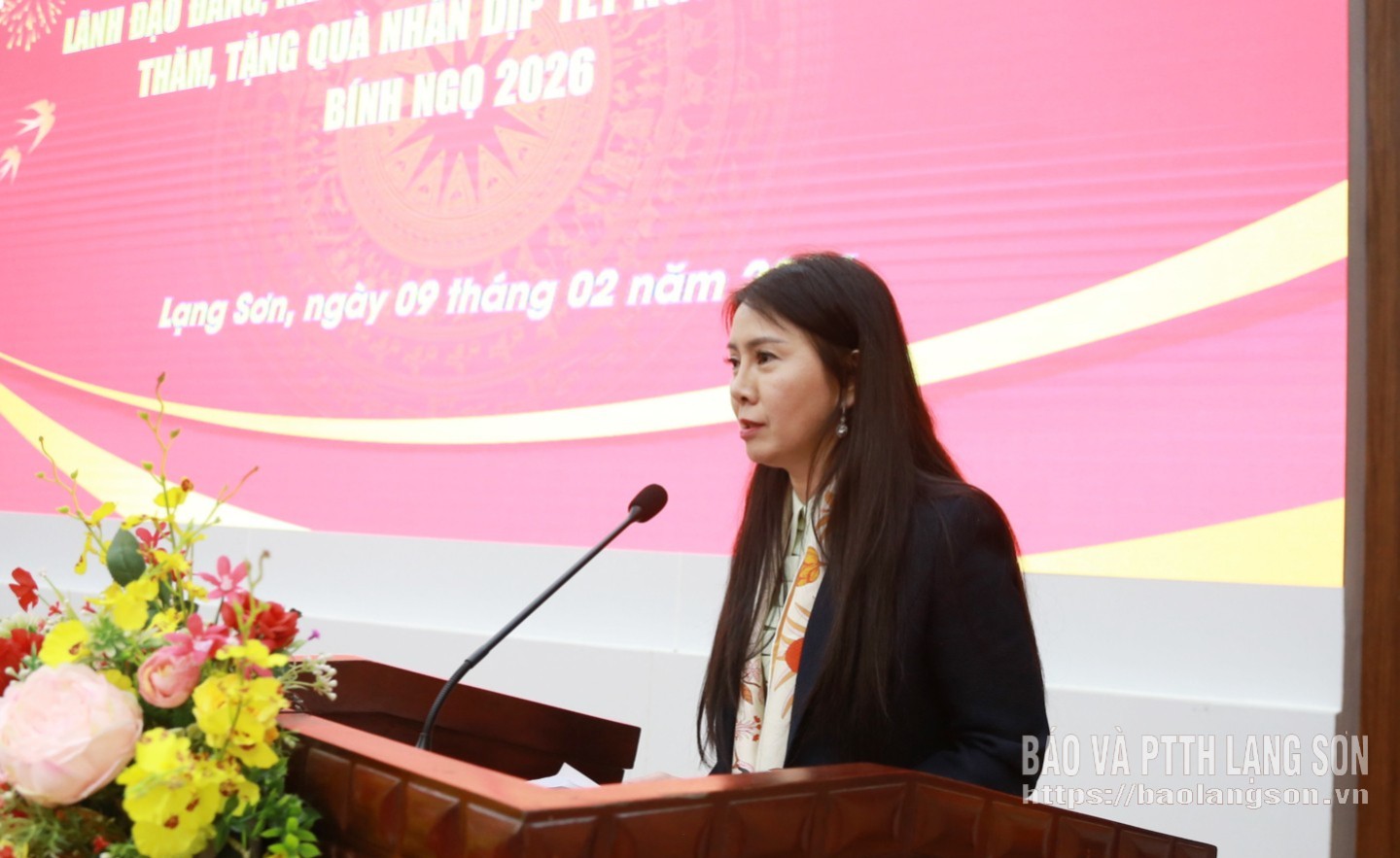 Đồng chí Đoàn Thu Hà, Phó Bí thư Tỉnh ủy, Chủ tịch Ủy ban MTTQ Việt Nam tỉnh phát biểu tại chương trình tặng quà tết các gia đình chính sách, hộ nghèo, đoàn viên, người lao động có hoàn cảnh khó khăn trên địa bàn tỉnh