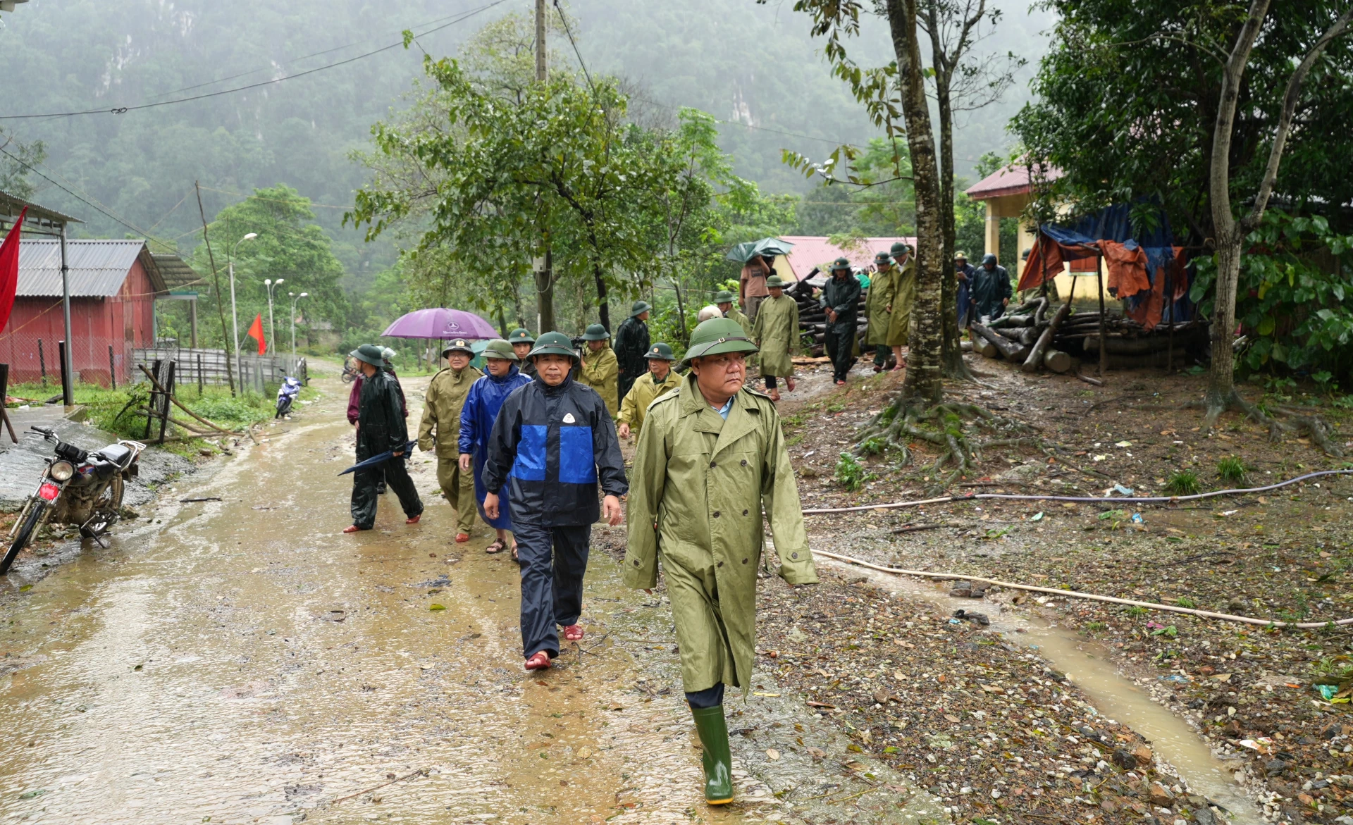 Đồng chí Chủ tịch UBND tỉnh Trần Phong kiểm tra công tác ứng phó mưa lũ tại các bản của xã Kim Phú - Ảnh: Trung Đức
