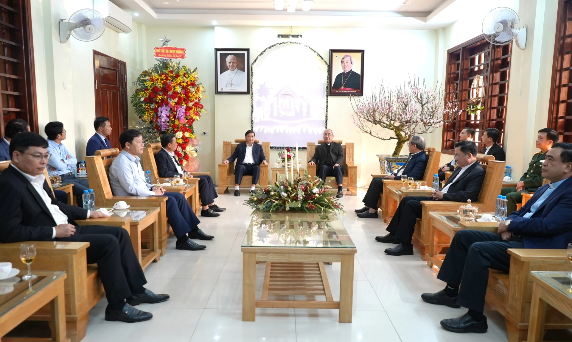 Đồng chí Lê Hồng Vinh, Chủ tịch UBND tỉnh chúc mừng Tòa Giám mục Giáo phận Hà Tĩnh nhân dịp Lễ giáng sinh 2025 - Ảnh: Trung Đức