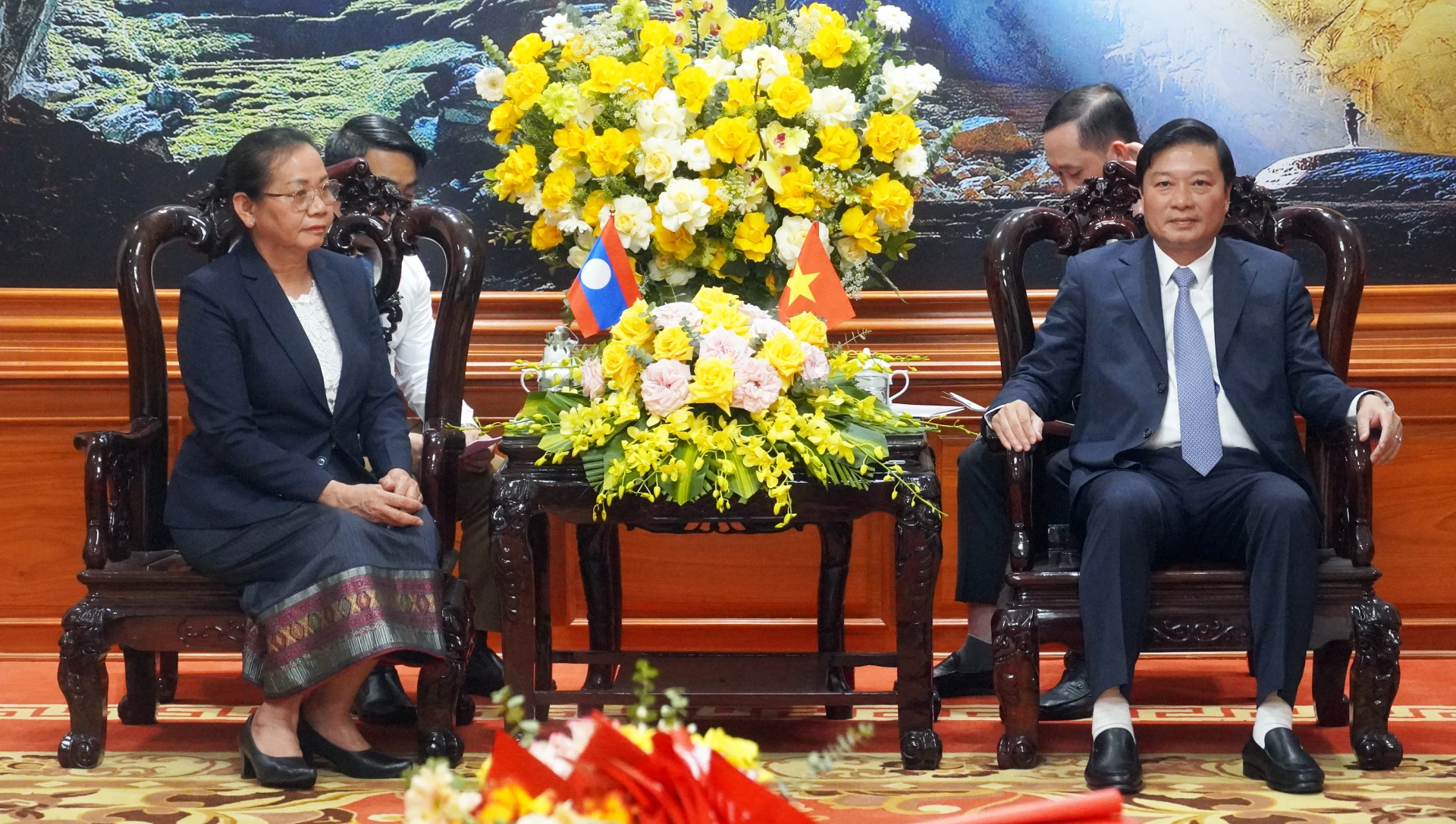 Trao đổi với đồng chí Phó Bí thư Tỉnh ủy, Chủ tịch UBND tỉnh Lê Hồng Vinh, đồng chí Vonekham CHEUANGMANIVONG thông tin khái quát nhiệm vụ và những kết quả hợp tác giữa hai Đảng, hai Nhà nước và các địa phương, trong đó có Quảng Trị.