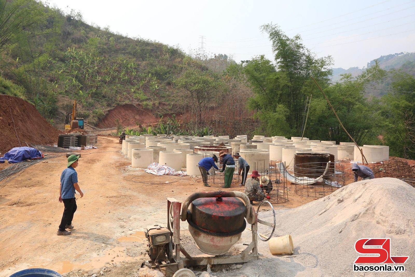 Công nhân Công ty TNHH Khang Lan thi công dự án đường bản Nhôm - Hua Mi, xã Yên Châu.