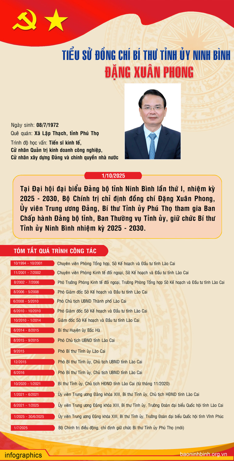 Căn cứ Điều lệ Đảng và các quy định, quy chế của Đảng, Bộ Chính trị đã ban hành Quyết định về việc chỉ định Bí thư, các Phó Bí thư Tỉnh ủy Ninh Bình nhiệm kỳ 2025-2030; Ban Chấp hành, Ban Thường vụ Tỉnh ủy Ninh Bình nhiệm kỳ 2025-2030; Quyết định về việc điều động, phân công, chỉ định đồng chí Đặng Xuân Phong, Ủy viên Trung ương Đảng, Bí thư Tỉnh ủy Phú Thọ tham gia Ban Chấp hành, Ban Thường vụ Tỉnh ủy, giữ chức vụ Bí thư Tỉnh ủy Ninh Bình, nhiệm kỳ 2025-2030 và tham gia Đảng ủy Quân khu 3.