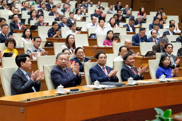 Tổng Bí thư Tô Lâm, Chủ tịch nước Lương Cường, Thủ tướng Phạm Minh Chính, Thường trực Ban Bí thư Trần Cẩm Tú với các đại biểu Quốc hội tham dự kỳ họp, sáng 10/11.
