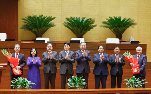 Tổng Bí thư Tô Lâm cùng các đồng chí lãnh đạo Đảng, Nhà nước tặng hoa chúc mừng Phó Chủ tịch Quốc hội Đỗ Văn Chiến và Chánh án TAND tối cao Nguyễn Văn Quảng.