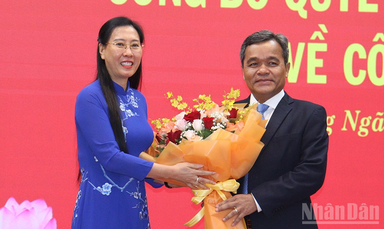 Đồng chí Bùi Thị Quỳnh Vân, Ủy viên Trung ương Đảng, Phó Trưởng ban Tổ chức Trung ương (nguyên Bí thư Tỉnh ủy Quảng Ngãi) tặng hoa chúc mừng tân Bí thư Tỉnh ủy Quảng Ngãi Hồ Văn Niên