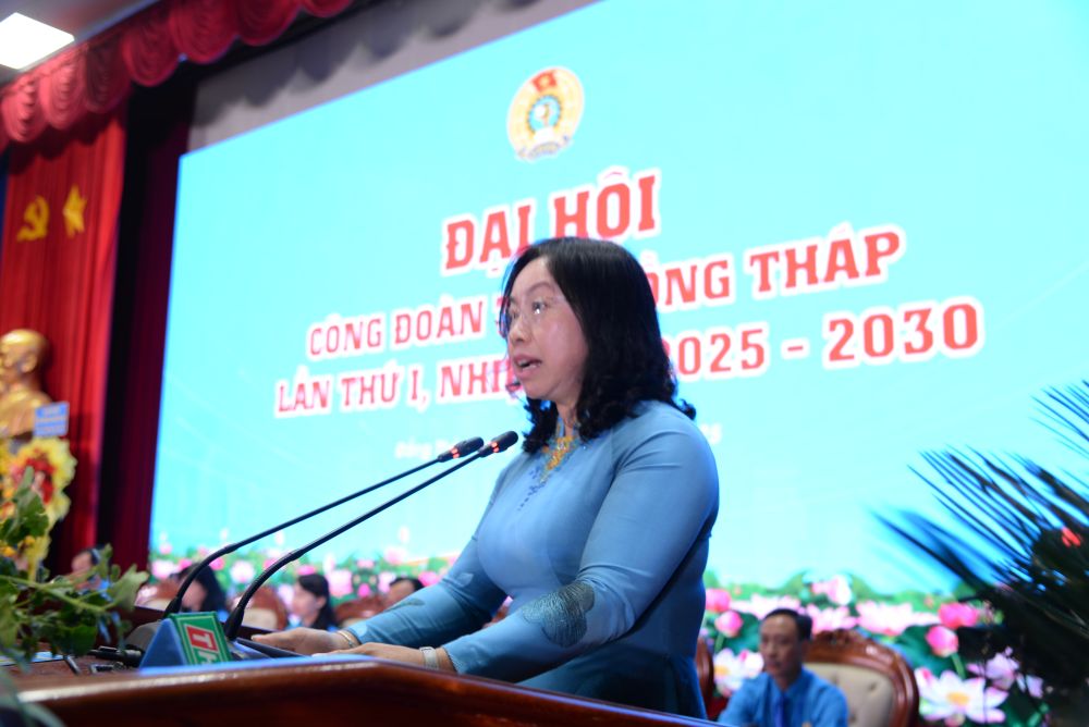 Phát biểu chỉ đạo Đại hội, Phó Chủ tịch Thường trực Tổng LĐLĐ Việt Nam Thái Thu Xương ghi nhận, biểu dương những kết quả, thành tích mà các cấp Công đoàn tỉnh Đồng Tháp đạt được trong giai đoạn 2023 - 2025.