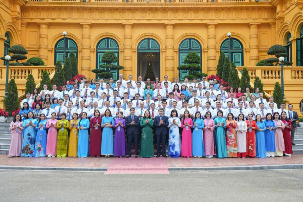 Các đại biểu và 101 Chủ tịch Công đoàn cơ sở tiêu biểu toàn quốc chụp ảnh lưu niệm tại Phủ Chủ tịch trong khuôn khổ chương trình tuyên dương năm 2026