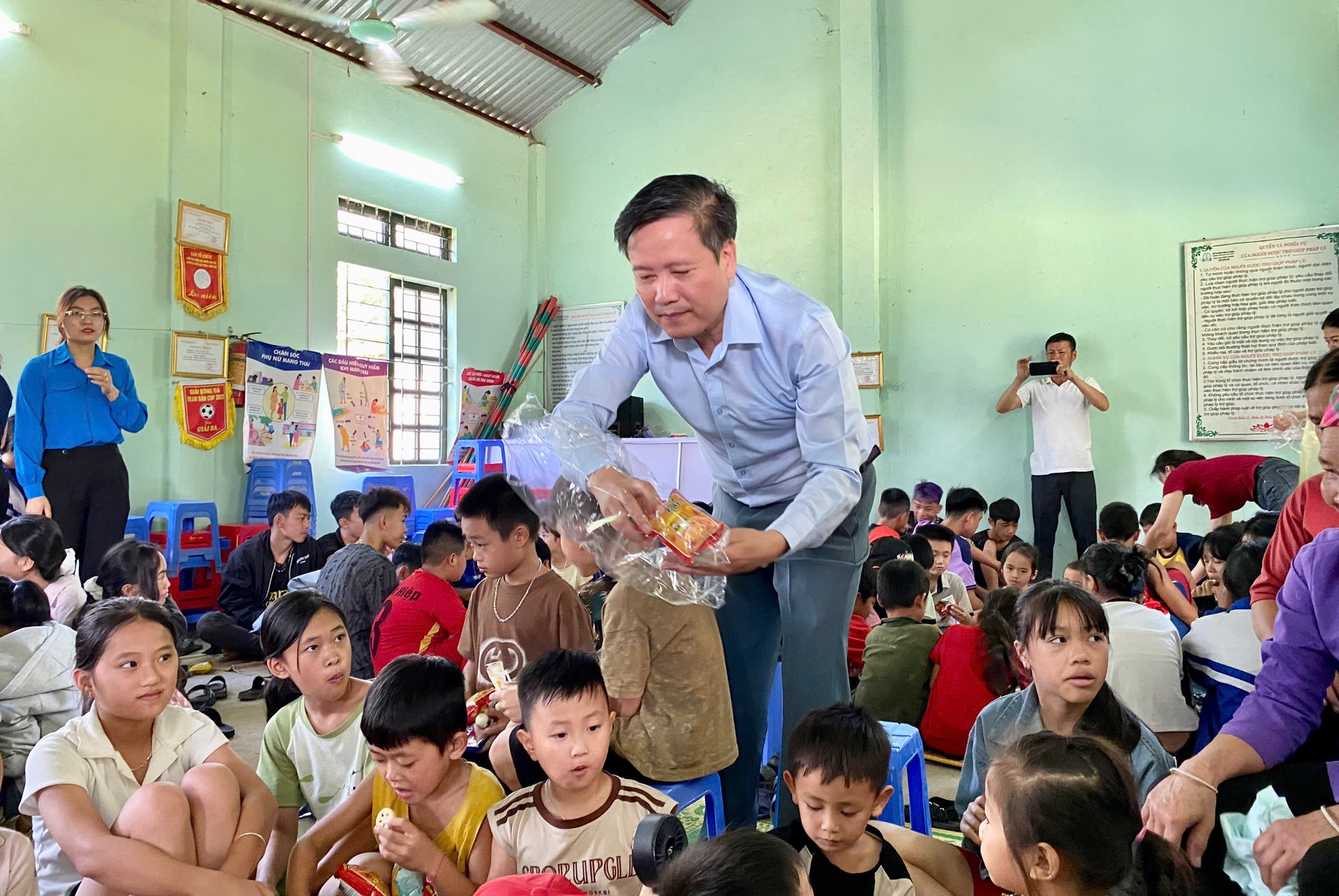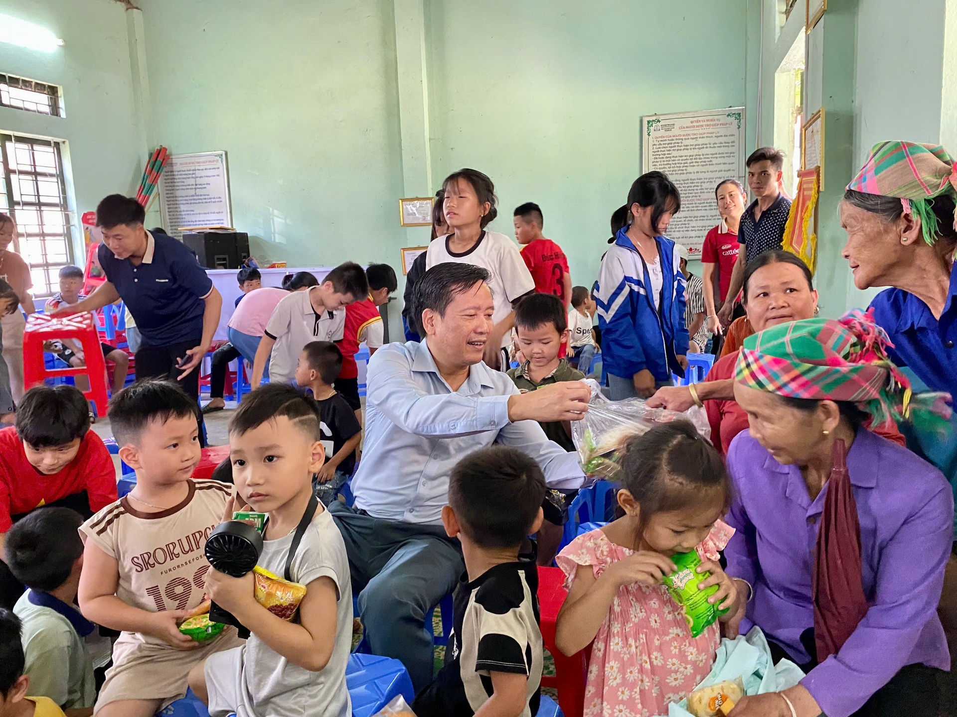 Đồng chí Lê Đức Dục - Ủy viên Ban Thường vụ, Trưởng Ban Tuyên giáo và Dân vận Tỉnh ủy tặng quà thiếu niên, nhi đồng xã Pắc Ta.