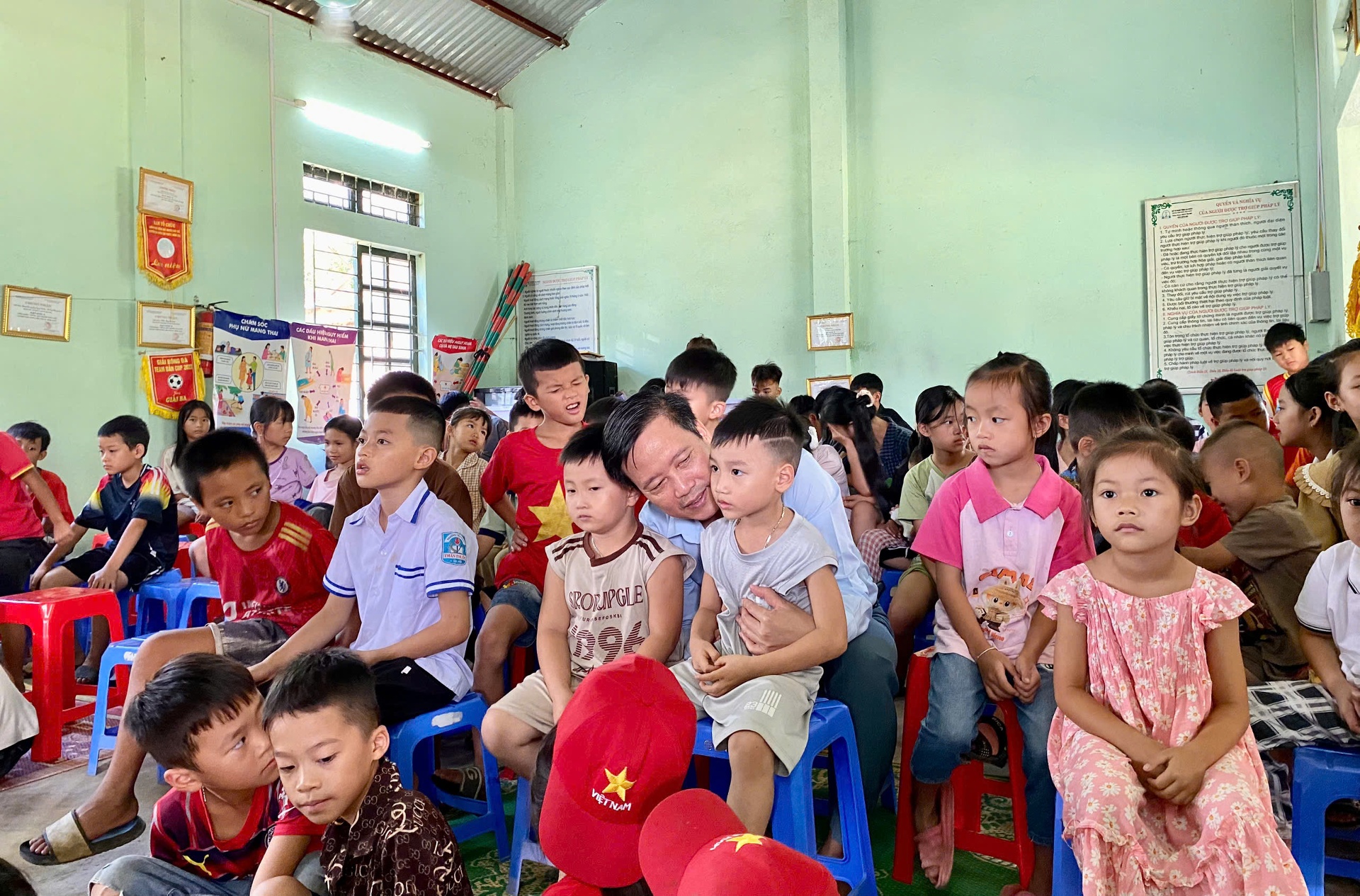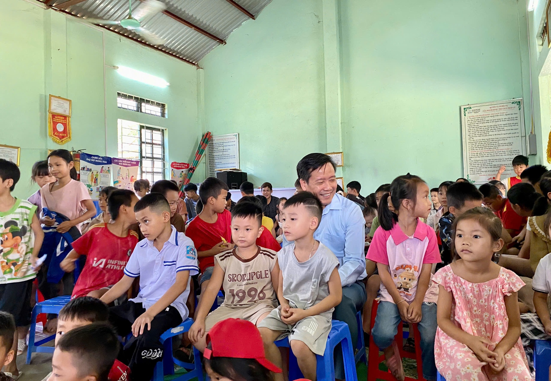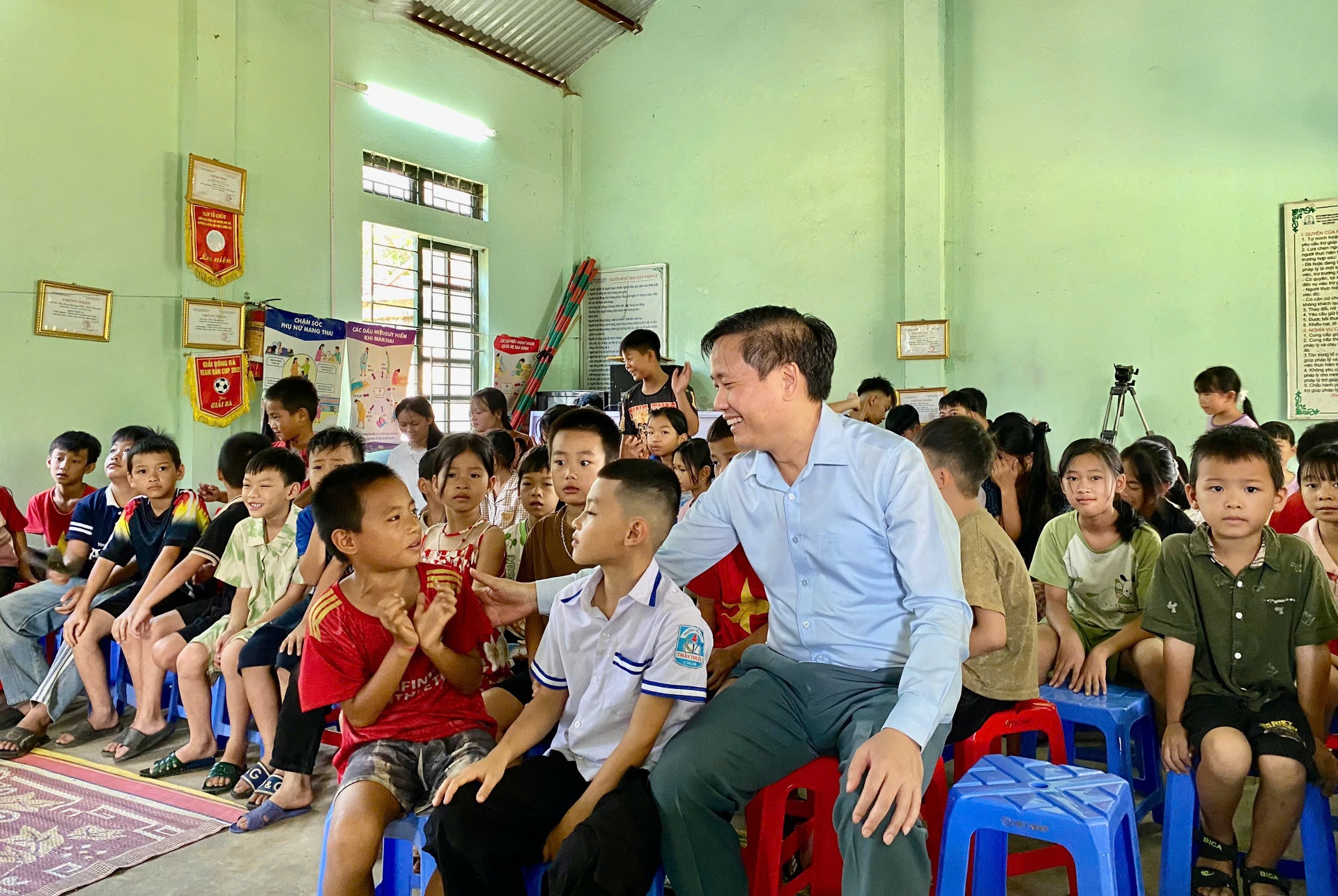 Đồng chí Lê Đức Dục - Ủy viên Ban Thường vụ, Trưởng Ban Tuyên giáo và Dân vận Tỉnh ủy ân cần hỏi thăm tình hình học tập, đời sống của các cháu thiếu niên, nhi đồng xã Tân Uyên.