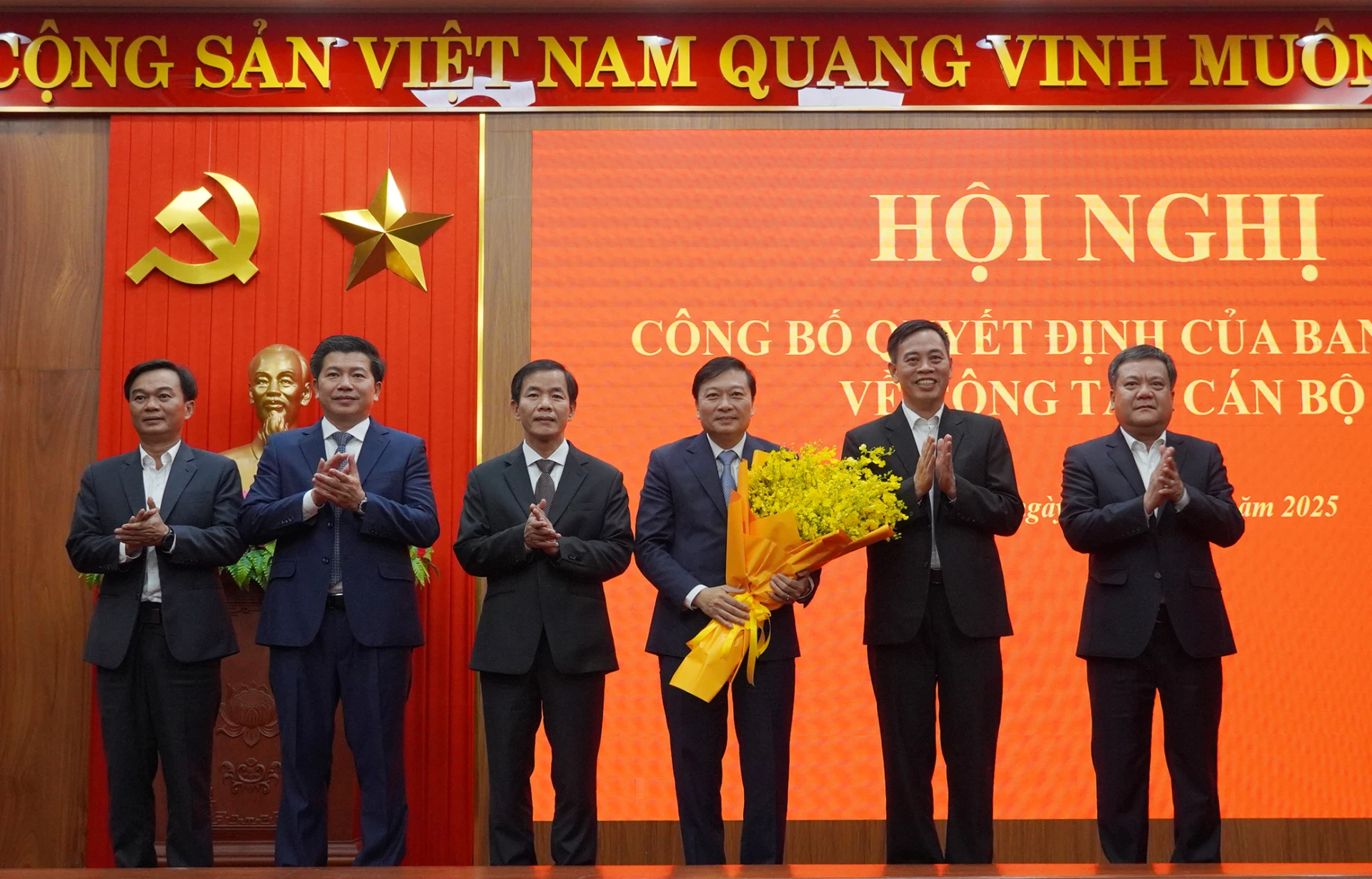 Đồng chí Phó Trưởng Ban Thường trực Ban Tổ chức Trung ương Hoàng Đăng Quang đã trao quyết định của Ban Bí thư Trung ương Đảng và tặng hoa chúc mừng đồng chí Phó Bí thư Tỉnh ủy Lê Hồng Vinh.