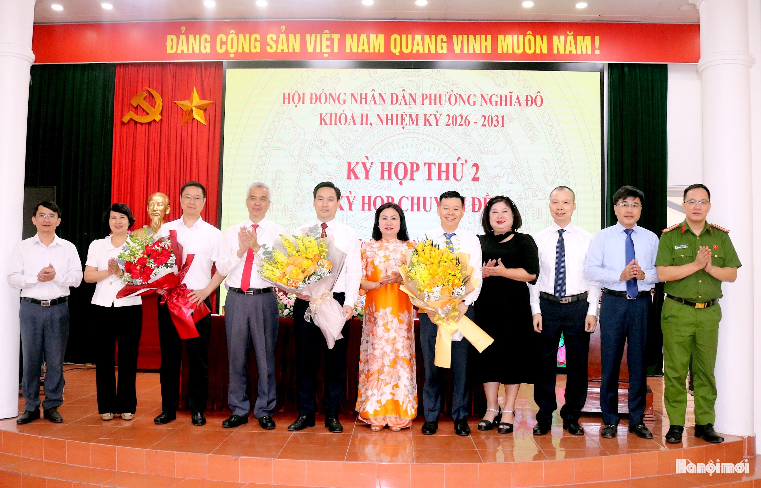 Lãnh đạo phường Nghĩa Đô tặng hoa chúc mừng đồng chí Lê Mạnh Tiến và các đồng chí trúng cử, miễn nhiệm. Ảnh: MT