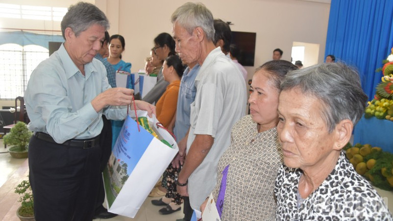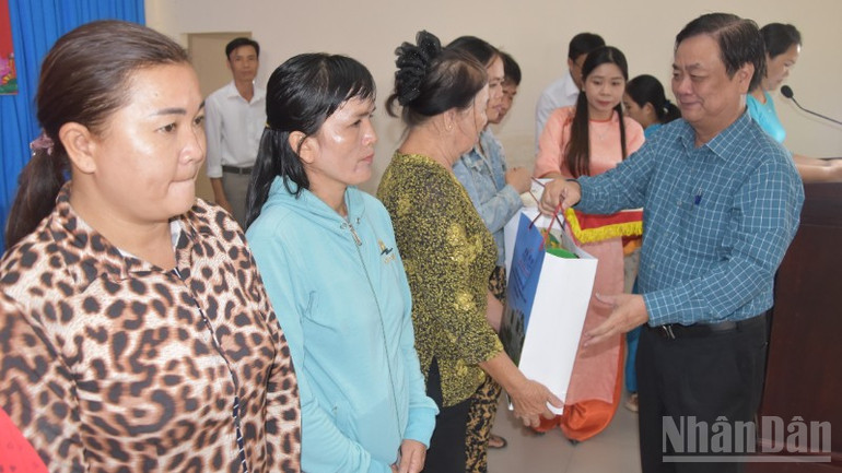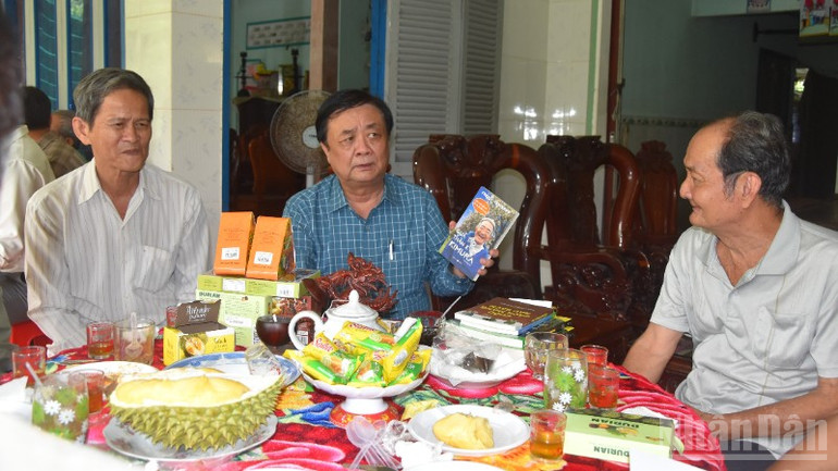 Đồng chí Lê Minh Hoan tặng quà cho gia đình chính sách, hộ nghèo, cận nghèo và gia đình tiêu biểu ở ấp Hòa Hảo.