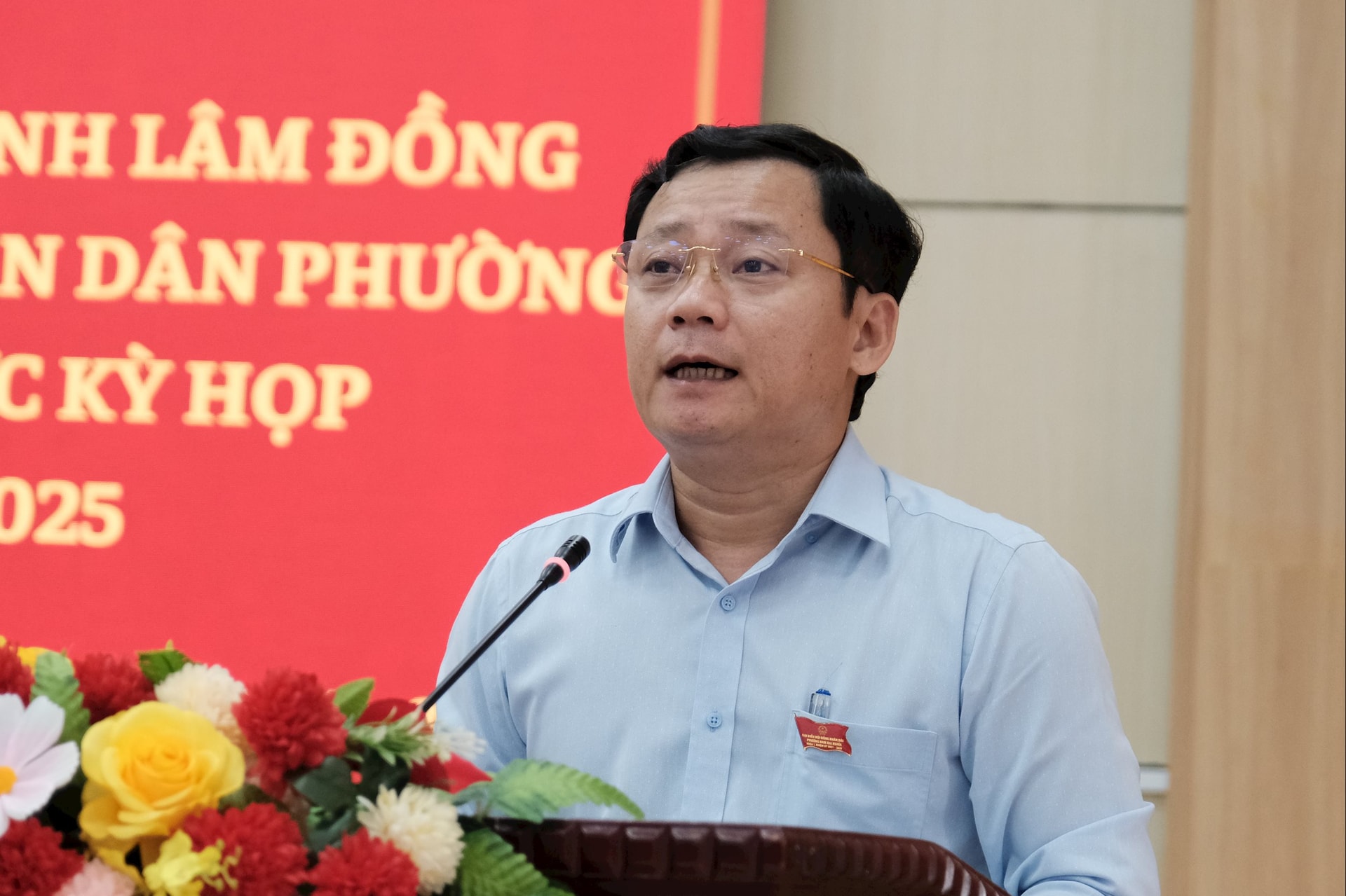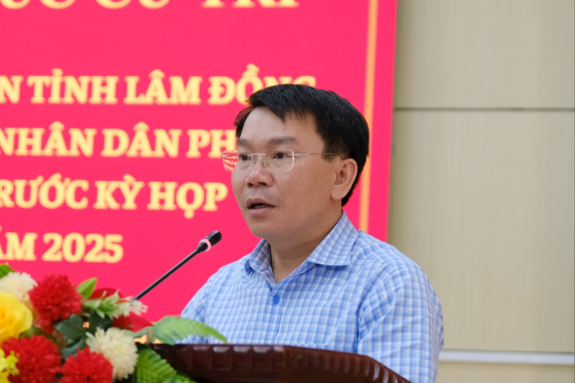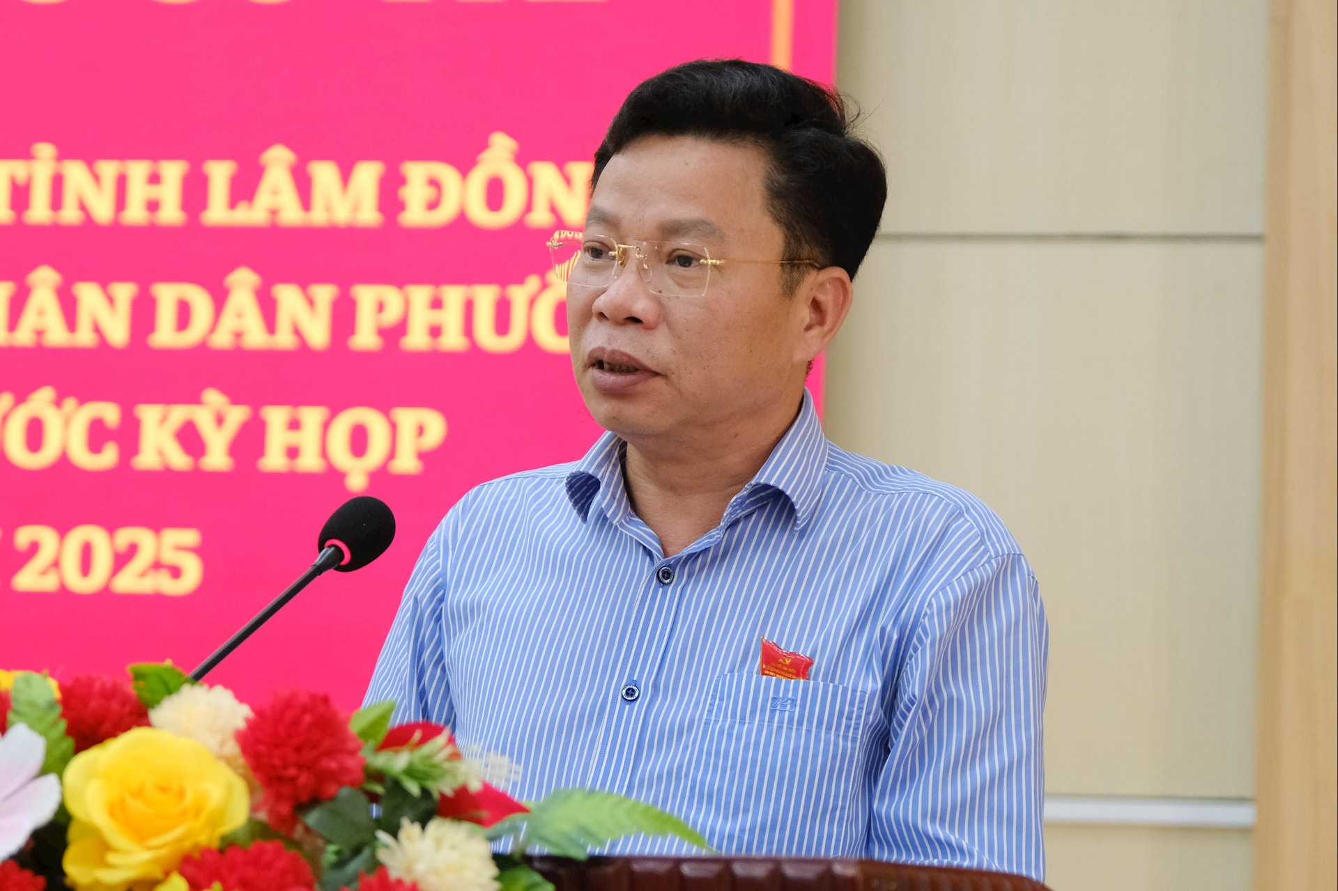 Đồng chí Võ Phạm Xuân Lâm, Ủy viên Ban Thường vụ Tỉnh ủy, Bí thư Đảng ủy phường Bắc Gia Nghĩa, đại biểu HĐND tỉnh báo cáo tình hình kinh tế - xã hội 10 tháng đầu năm 2025 của tỉnh; kết quả giải quyết ý kiến, kiến nghị của cử tri sau Kỳ họp thứ 2, HĐND tỉnh khóa X
