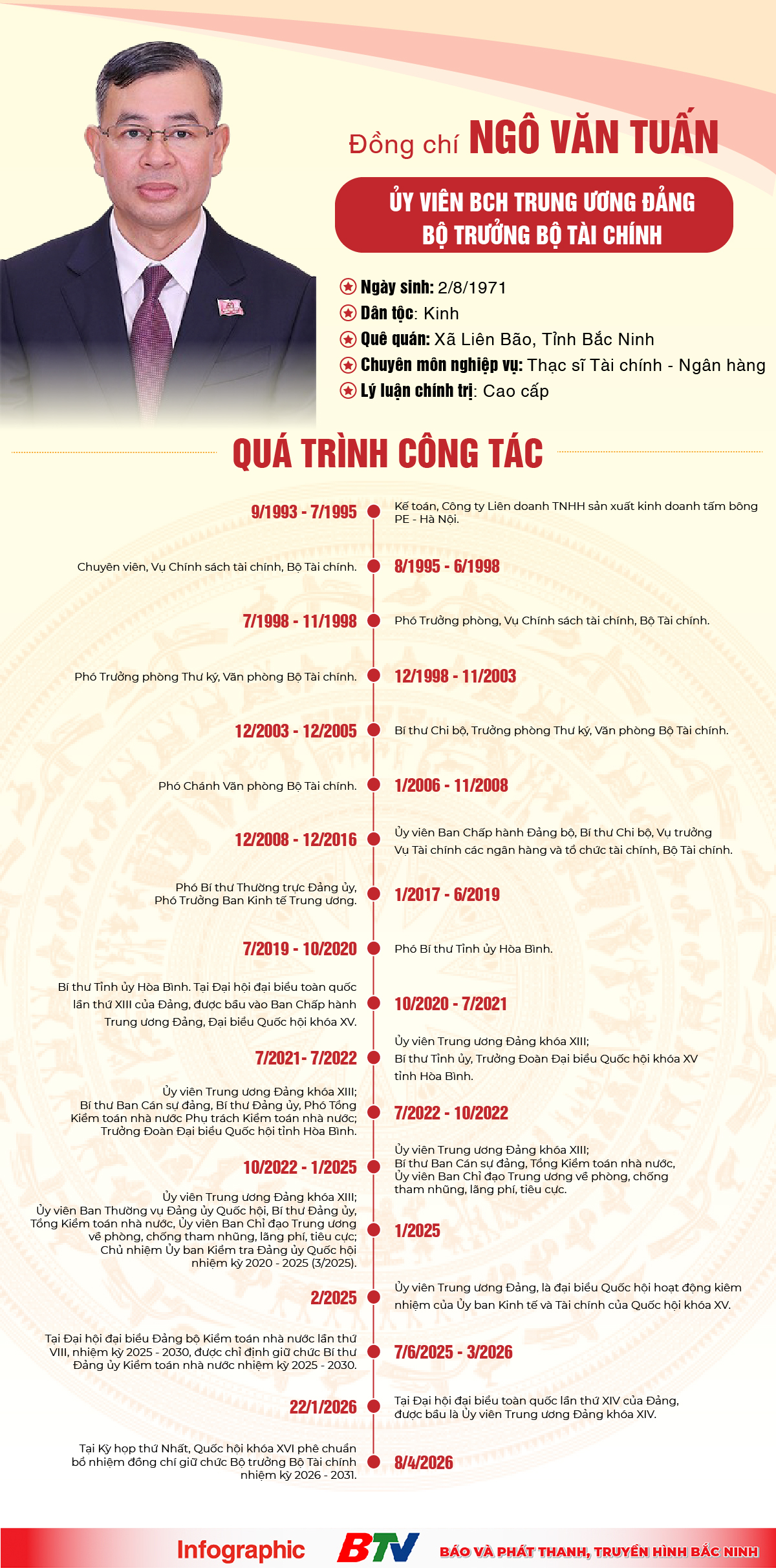 Đồng chí Ngô Văn Tuấn, Ủy viên Trung ương Đảng, Tổng Kiểm toán Nhà nước nhiệm kỳ 2021 - 2026 được Quốc hội phê chuẩn bổ nhiệm giữ chức Bộ trưởng Bộ Tài chính nhiệm kỳ 2026 - 2031.