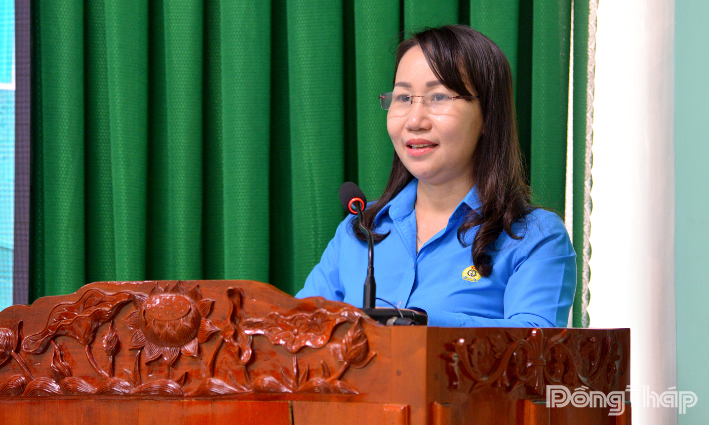 Đồng chí Ngô Thị Thùy Trang, Phó Chủ tịch Liên đoàn Lao động tỉnh Đồng Tháp phát biểu tại hội nghị.
