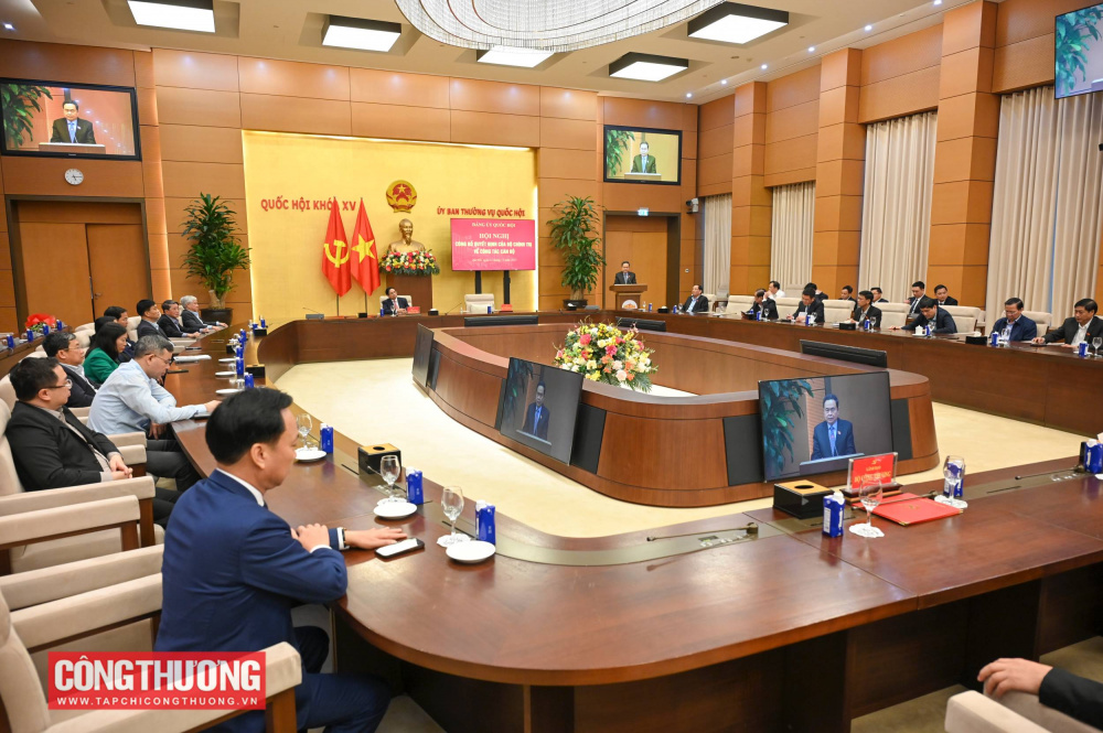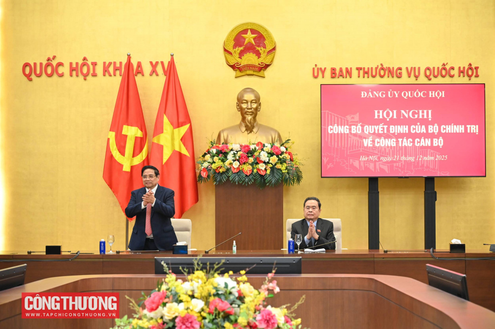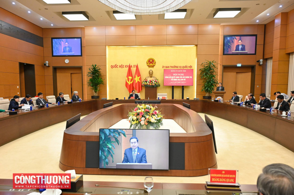 Ủy viên Bộ Chính trị, Bí thư Đảng ủy Chính phủ, Thủ tướng Chính phủ Phạm Minh Chính và Ủy viên Bộ Chính trị, Bí thư Đảng ủy Quốc hội, Chủ tịch Quốc hội Trần Thanh Mẫn đã dự Hội nghị công bố Quyết định của Bộ Chính trị về công tác cán bộ