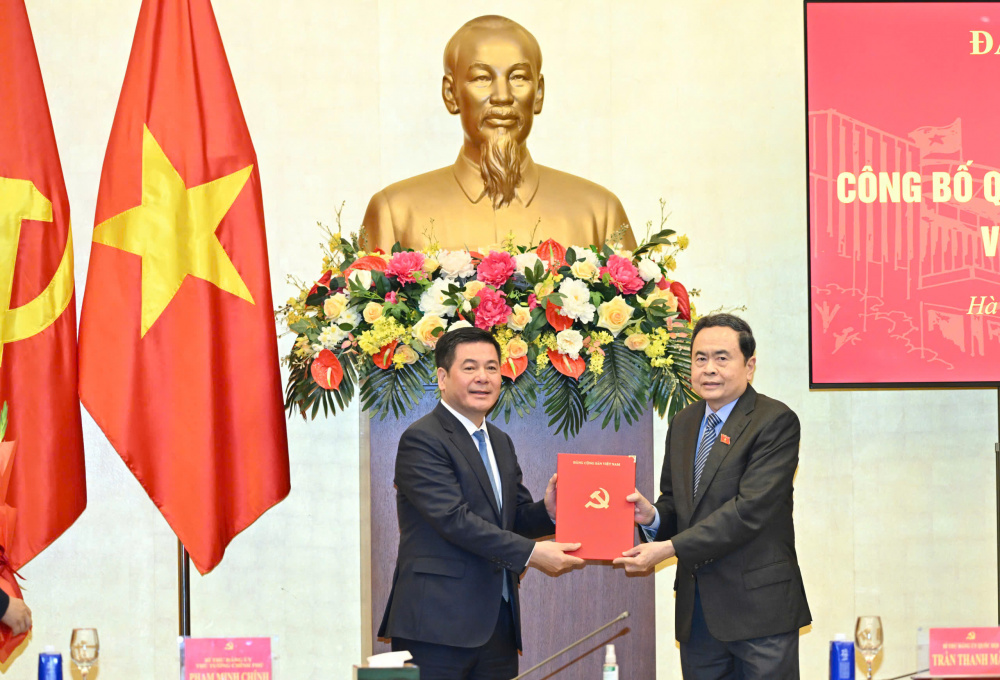 Bí thư Đảng ủy Quốc hội, Chủ tịch Quốc hội Trần Thanh Mẫn trao quyết định của Bộ Chính trị về việc điều động, phân công đồng chí Nguyễn Hồng Diên - Bí thư Đảng ủy, Bộ trưởng Bộ Công Thương giữ chức Phó Bí thư chuyên trách Đảng ủy Quốc hội
