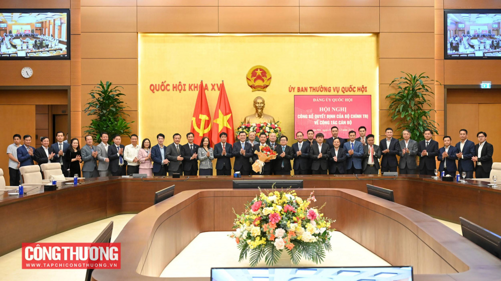 Các đồng chí lãnh đạo tặng hoa chúc mừng tân Phó Bí thư chuyên trách Đảng ủy Quốc hội Nguyễn Hồng Diên
