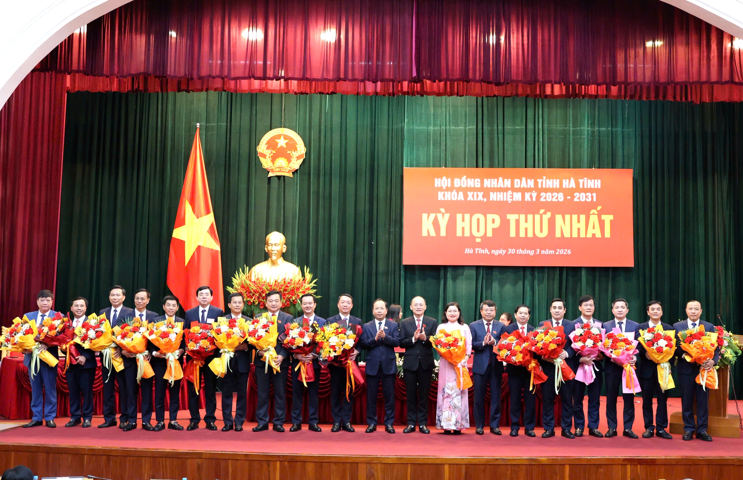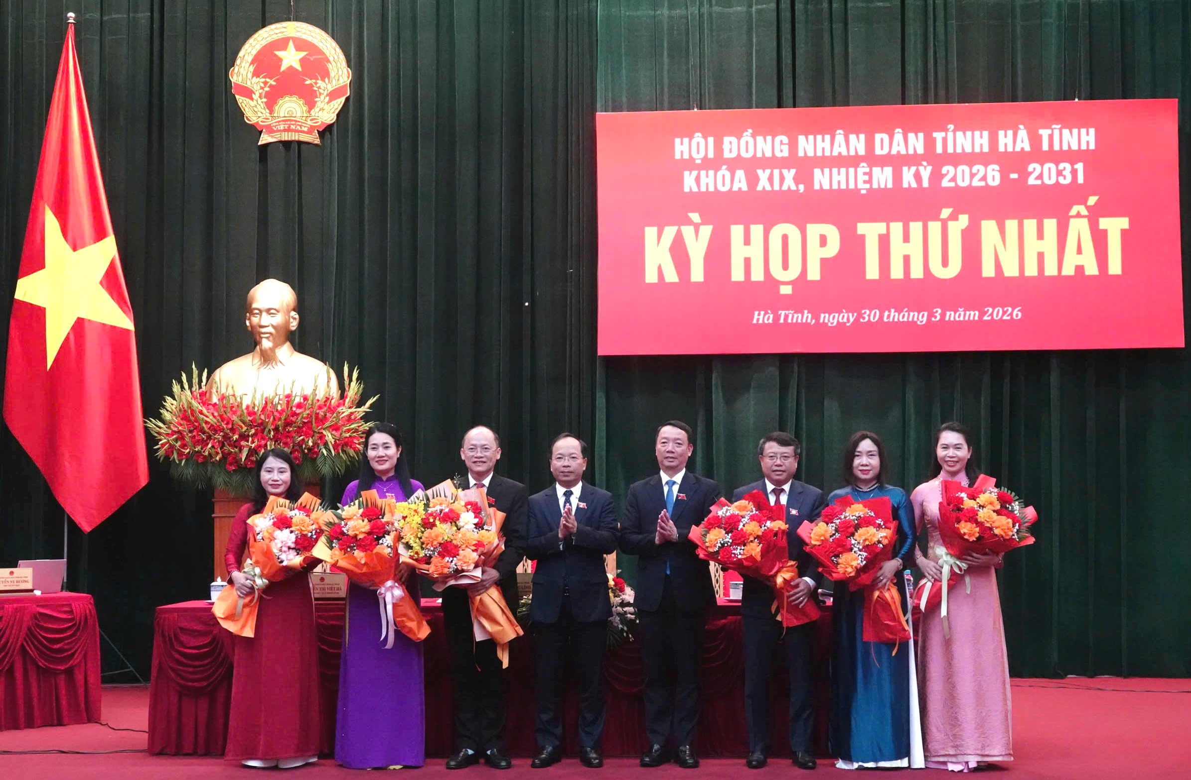 Các đồng chí Thường trực HĐND tỉnh Hà Tĩnh tặng hoa chúc mừng lãnh đạo UBND tỉnh và các Ủy viên UBND tỉnh nhiệm kỳ 2026-2031