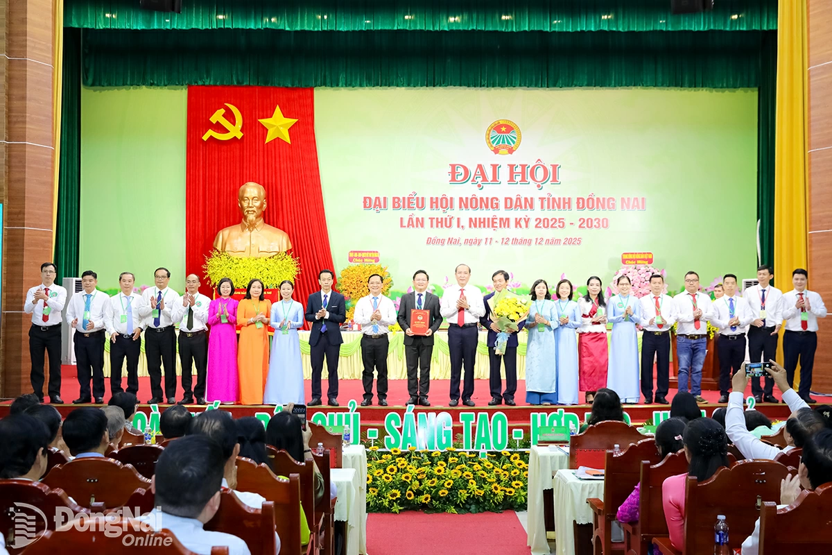Đồng chí Phan Như Nguyện, Ủy viên dự khuyết Trung ương Đảng, Phó Chủ tịch Thường trực Ban Chấp hành Trung ương Hội Nông dân Việt Nam và đồng chí Huỳnh Thị Hằng, Phó Bí thư Tỉnh ủy, Chủ tịch Ủy ban MTTQ Việt Nam tỉnh trao quyết định và tặng hoa cho Ban Chấp hành Hội Nông dân tỉnh Đồng Nai khóa I, nhiệm kỳ 2025-2030. Ảnh: Huy Anh