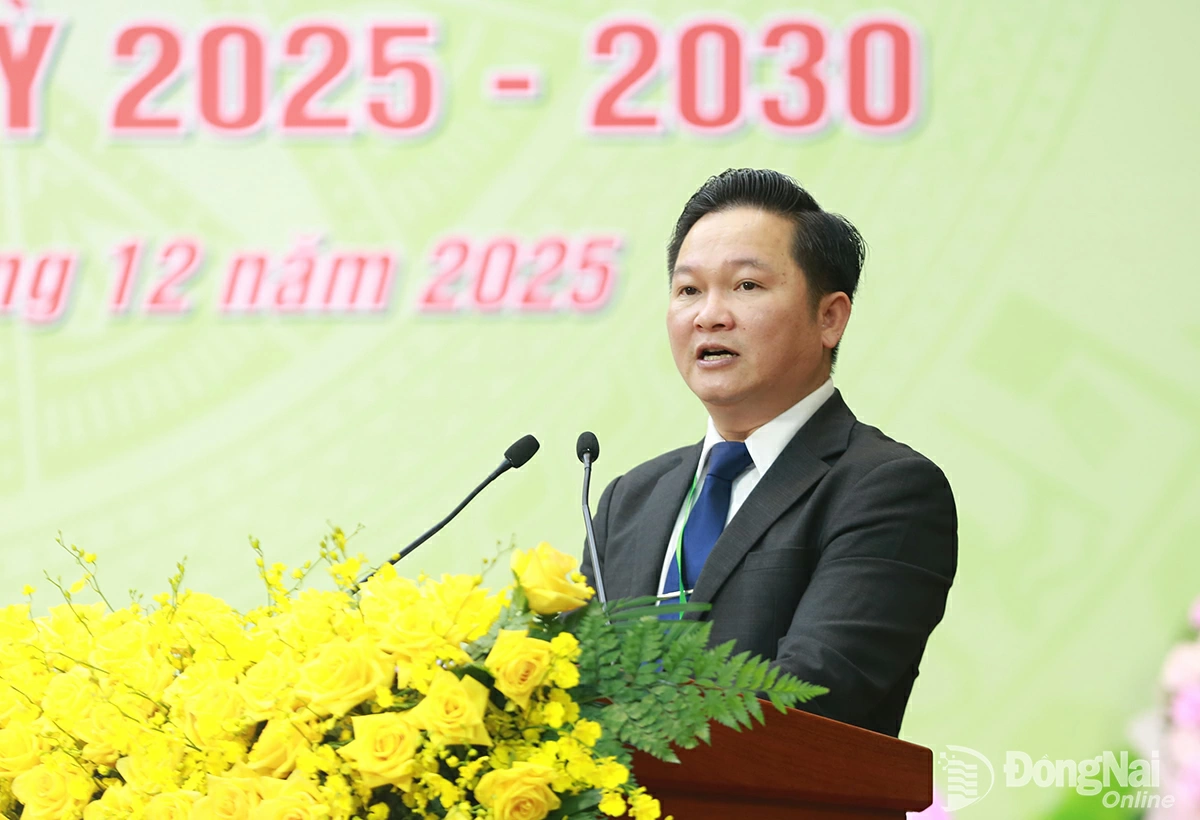 Đồng chí Nguyễn Hữu Nguyên, Ủy viên Trung ương Hội Nông dân Việt Nam, Tỉnh ủy viên, Phó Chủ tịch Ủy ban MTTQ Việt Nam tỉnh, Chủ tịch Hội Nông dân tỉnh Đồng Nai phát biểu tại đại hội. Ảnh: Huy Anh