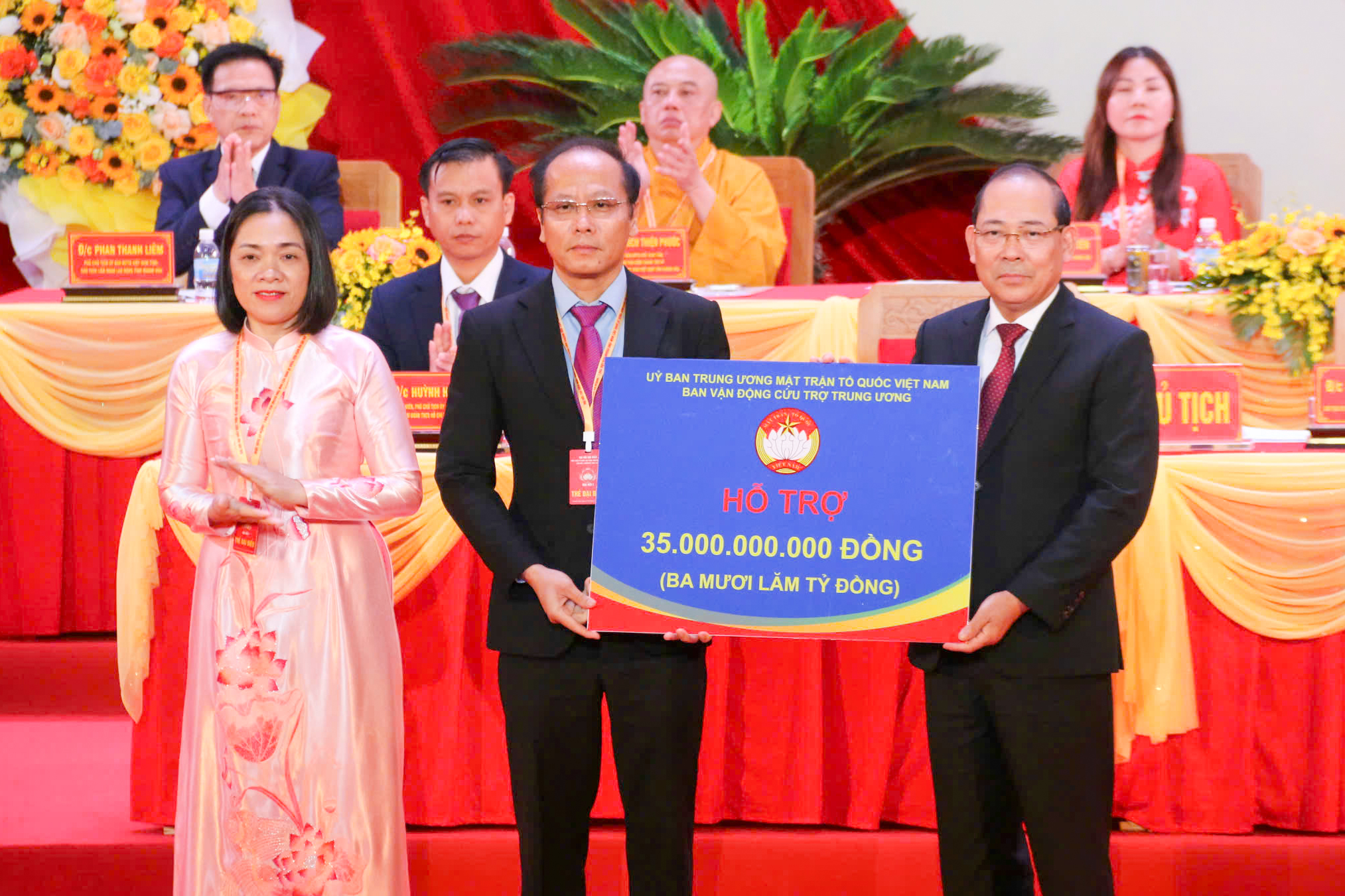 Dịp này, Ủy ban Trung ương MTTQ Việt Nam trao 35 tỷ đồng ủng hộ Nhân dân Khánh Hòa khắc phục hậu quả thiệt hại do mưa lũ. Ảnh: HIẾU GIANG