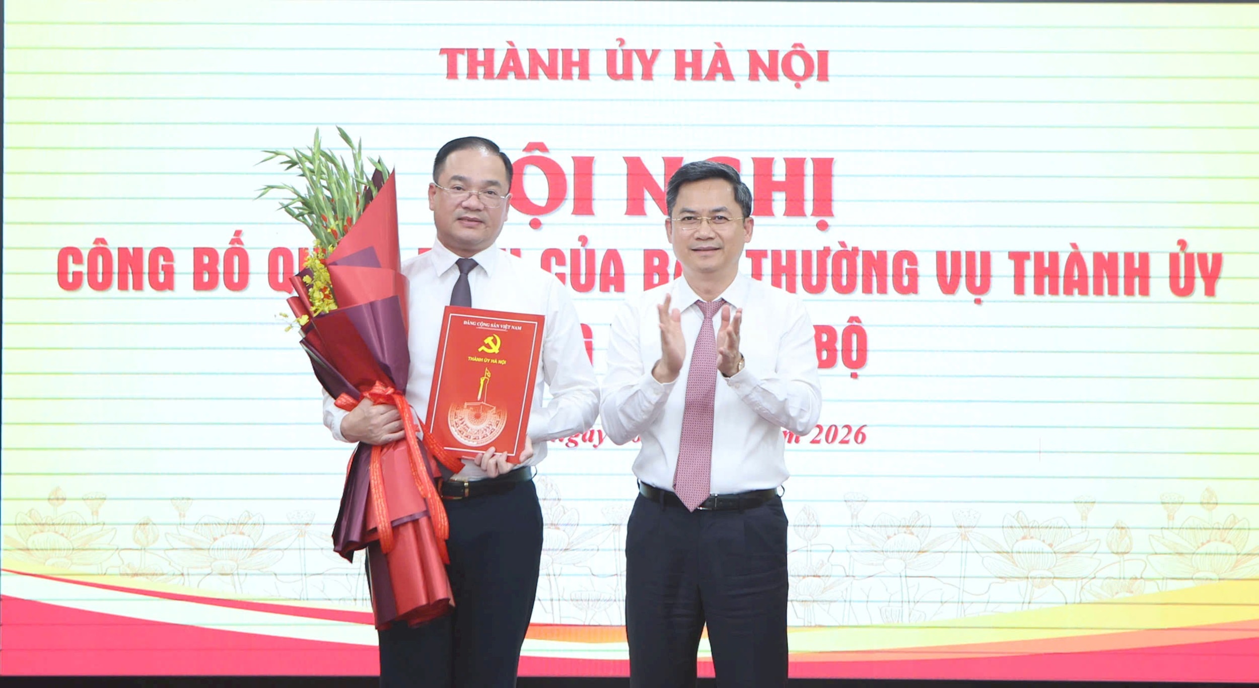 Trưởng ban Tổ chức Thành ủy Hà Minh Hải trao quyết định, tặng hoa chúc mừng đồng chí Nguyễn Ngọc Việt. Ảnh: Thanh Hải