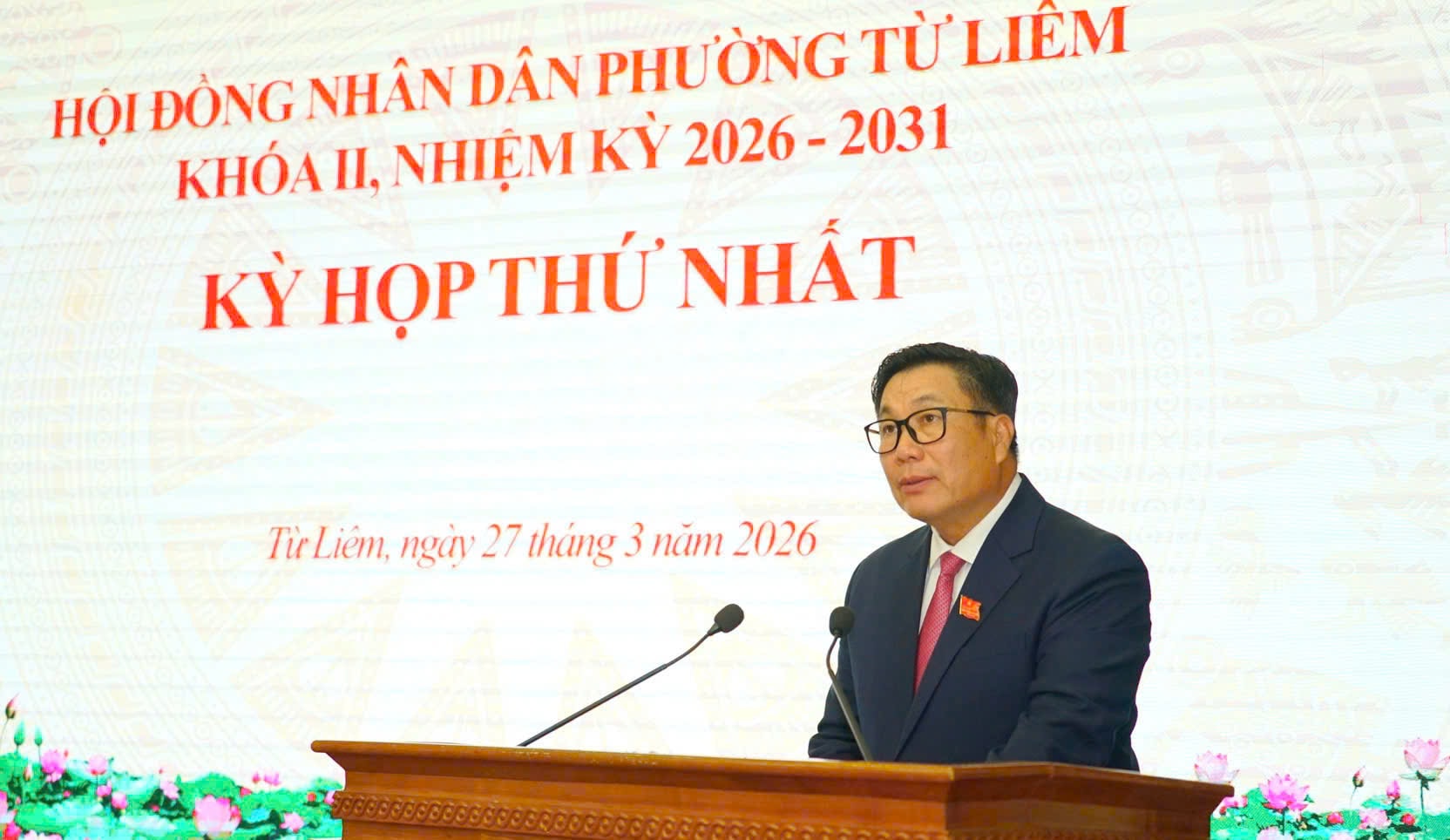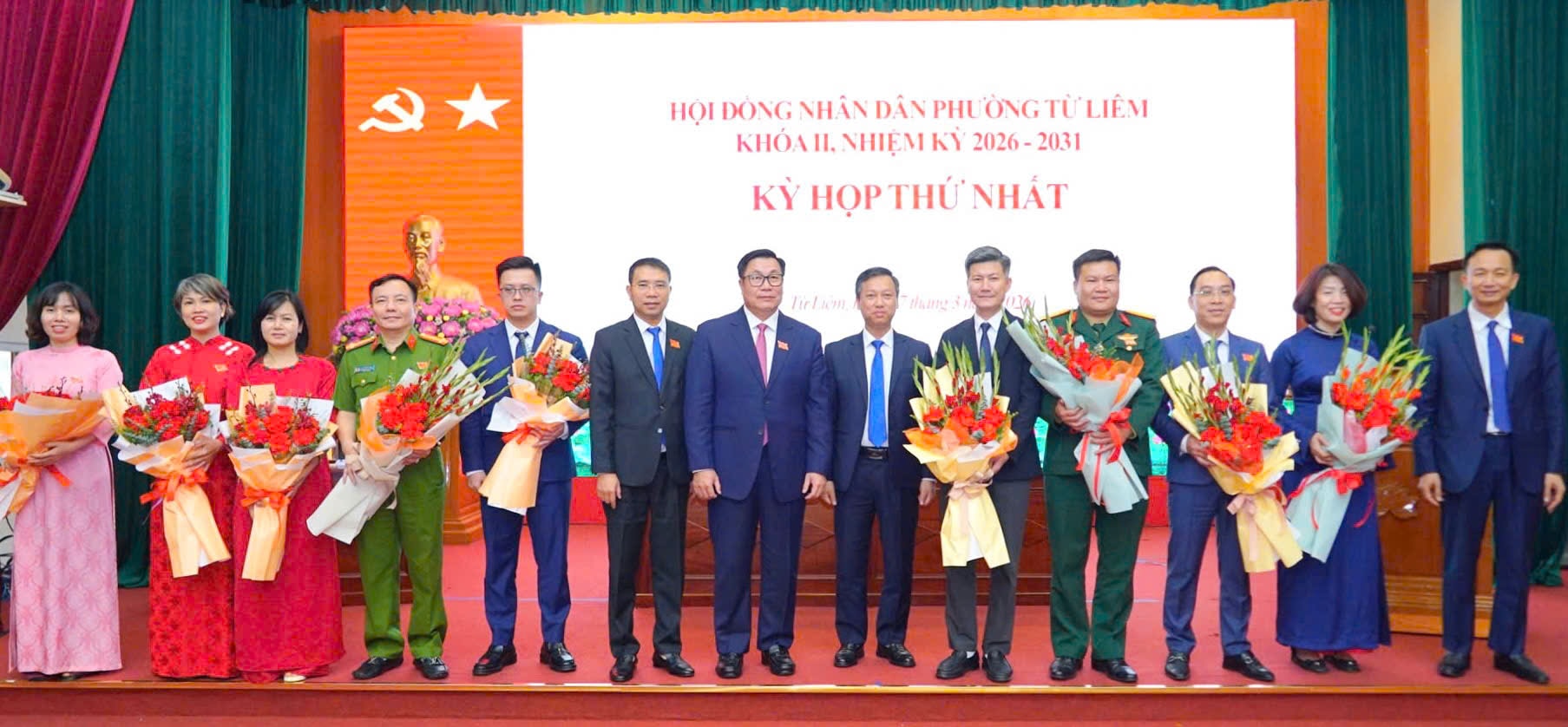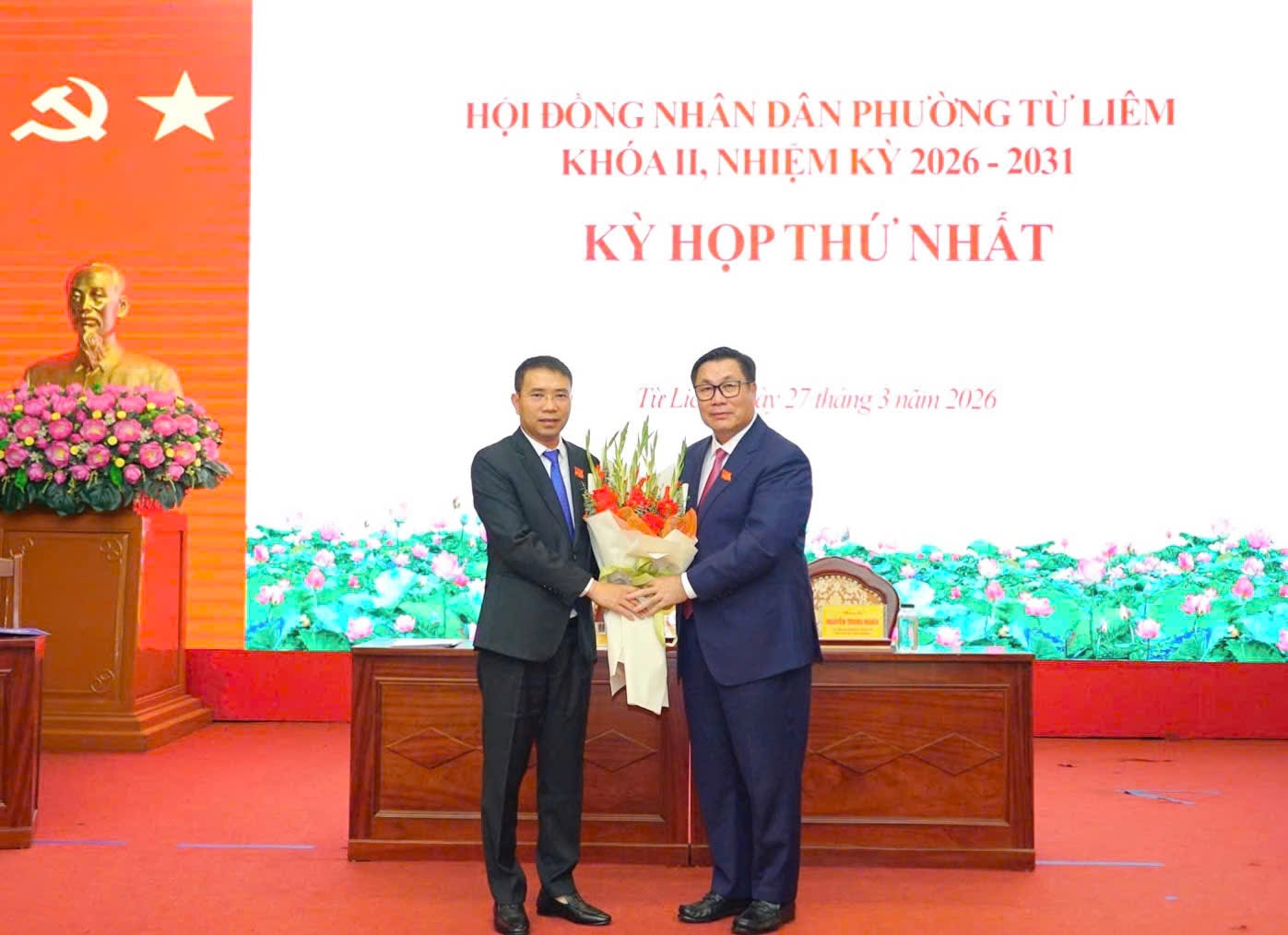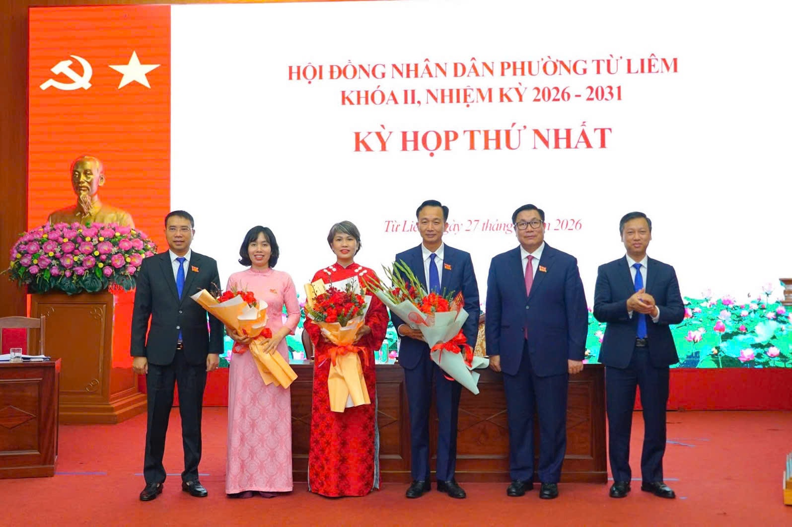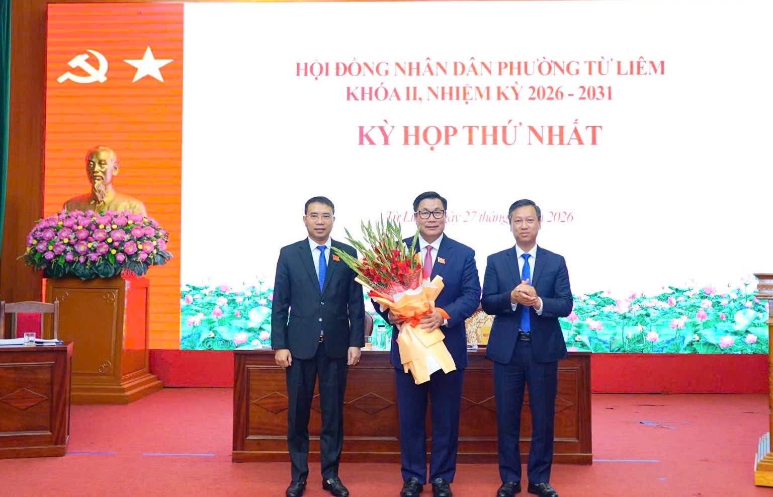 Các đồng chí lãnh đạo phường Từ Liêm tặng hoa, chúc mừng đồng chí Nguyễn Quang Hiếu, Bí thư Đảng ủy, Chủ tịch HĐND phường nhiệm kỳ 2026-2031. Ảnh: Trung Hiếu