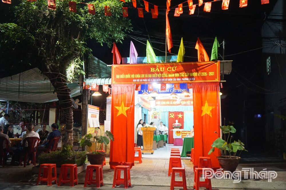 Không khí trang nghiêm và rực rỡ cờ hoa tại khu vực bỏ phiếu số 11 (Văn phòng khóm Cầu Đình, phường Sa Đéc) vào sáng sớm ngày 15-3.