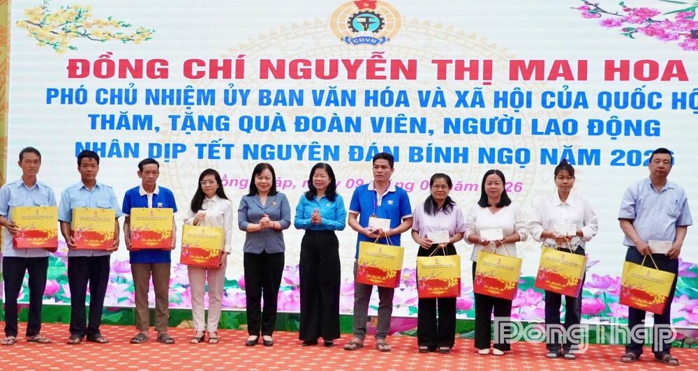 Phó Chủ nhiệm Ủy ban Văn hóa và Xã hội của Quốc hội Nguyễn Thị Mai Hoa (thứ 5 từ trái sang) và Chủ tịch Liên đoàn Lao động tỉnh Đồng Tháp Huỳnh Thị Tuyết Vui trao quà tết cho đoàn viên, người lao động.