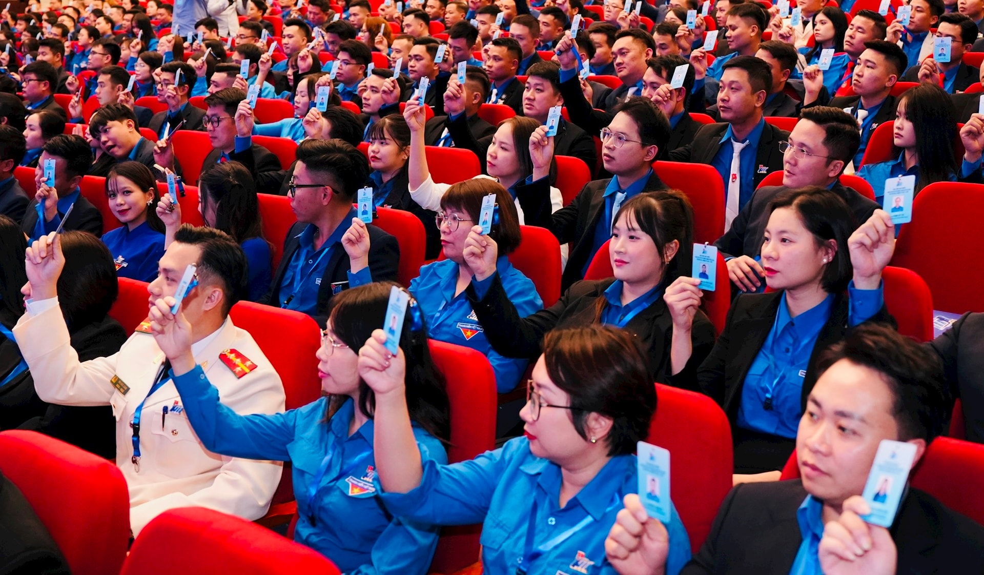 Các đại biểu biểu quyết bầu Ban Chấp hành Đoàn TNCS Hồ Chí Minh thành phố Hà Nội khóa XVII. Ảnh: PV