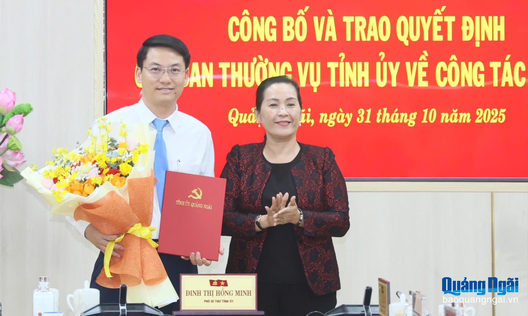 Phó Bí thư Tỉnh ủy Đinh Thị Hồng Minh đã trao Quyết định của Ban Thường vụ Tỉnh ủy và tặng hoa chúc mừng đồng chí Nguyễn Văn Đông.