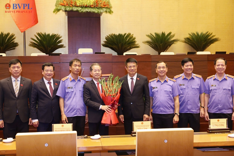 Các đồng chí Lãnh đạo VKSND tối cao và đại biểu chúc mừng đồng chí Nguyễn Văn Quảng, Chánh án Tòa án nhân dân tối cao.