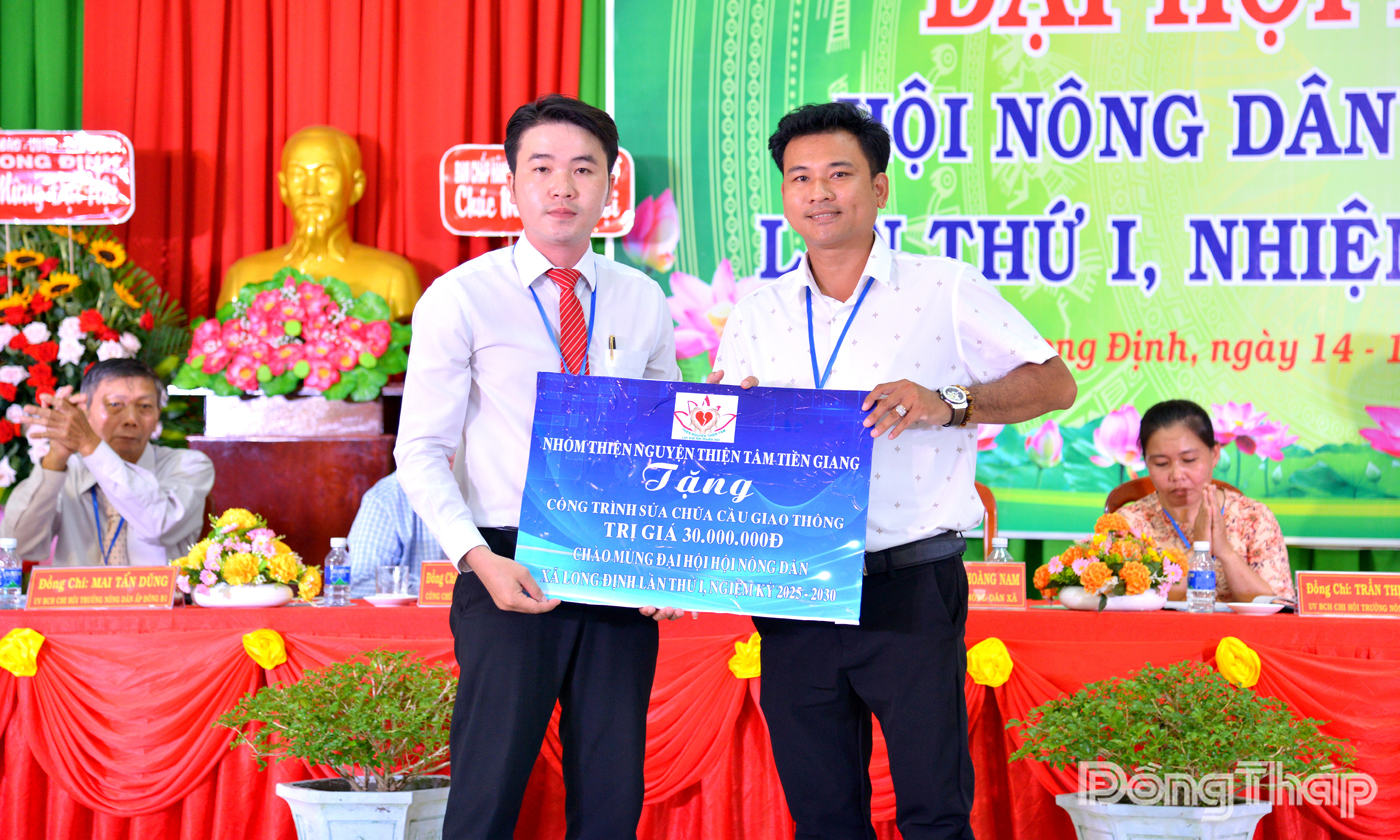 Nhóm Thiện nguyện thiện tâm Tiền Giang trao tặng Bảng tượng trưng Công trình sửa chữa cầu giao thông trị giá 30 triệu đồng cho Hội Nông dân xã Long Định.