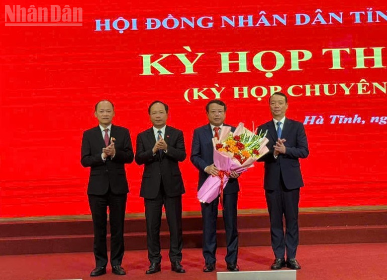 Các đồng chí Thường trực Tỉnh ủy Hà Tĩnh tặng hoa chúc mừng Tân Phó Chủ tịch Thường trực Hội đồng nhân dân tỉnh Hà Tĩnh Dương Tất Thắng.