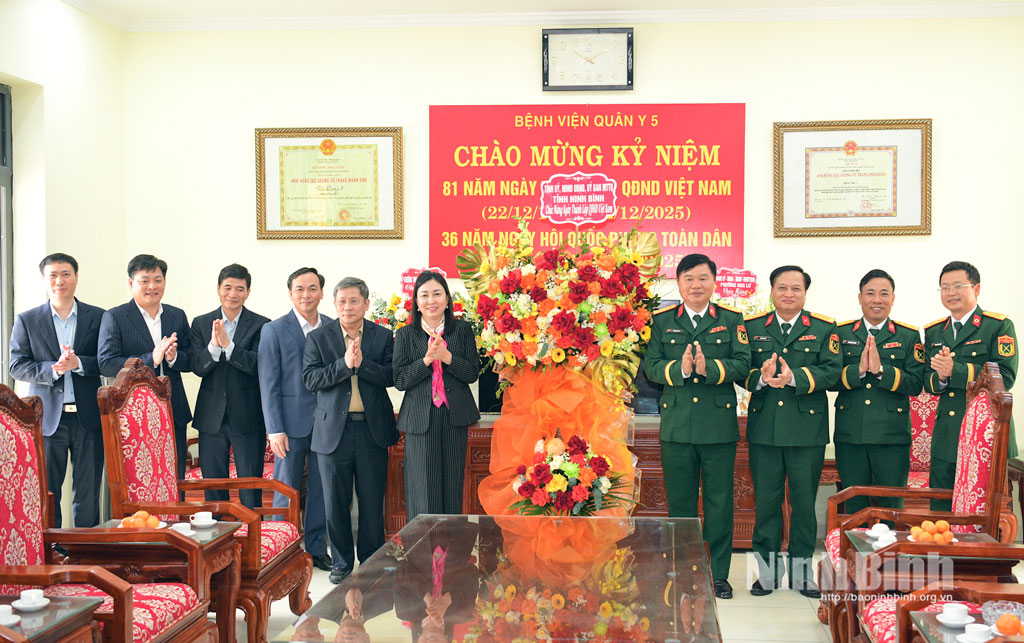 Thăm, chúc mừng tại Bệnh viện Quân y 5, đồng chí Phó Bí thư Thường trực Tỉnh ủy Đinh Thị Lụa vui mừng về những thành tích trong 75 năm xây dựng và phát triển của Bệnh viện Quân y 5; đơn vị luôn thực hiện tốt nhiệm vụ chuyên môn, cung cấp các dịch vụ y tế chất lượng cao cho người dân tỉnh Ninh Bình và các tỉnh lân cận. Năm 2025, Bệnh viện đã khám cho hơn 76.000 lượt người bệnh, thu dung điều trị hơn 70.000 lượt người bệnh, trong đó 90% người bệnh là người dân trong tỉnh và các tỉnh lân cận. Bên cạnh đó, Bệnh viện luôn tích cực tham gia các hoạt động khám, chữa bệnh, cấp phát thuốc miễn phí cho người nghèo, có mối quan hệ gắn bó với nhân dân địa phương, qua đó góp phần cùng tỉnh Ninh Bình hoàn thành nhiều chỉ tiêu quan trọng trong phát triển y tế, chăm lo đời sống nhân dân ngày càng tốt hơn.