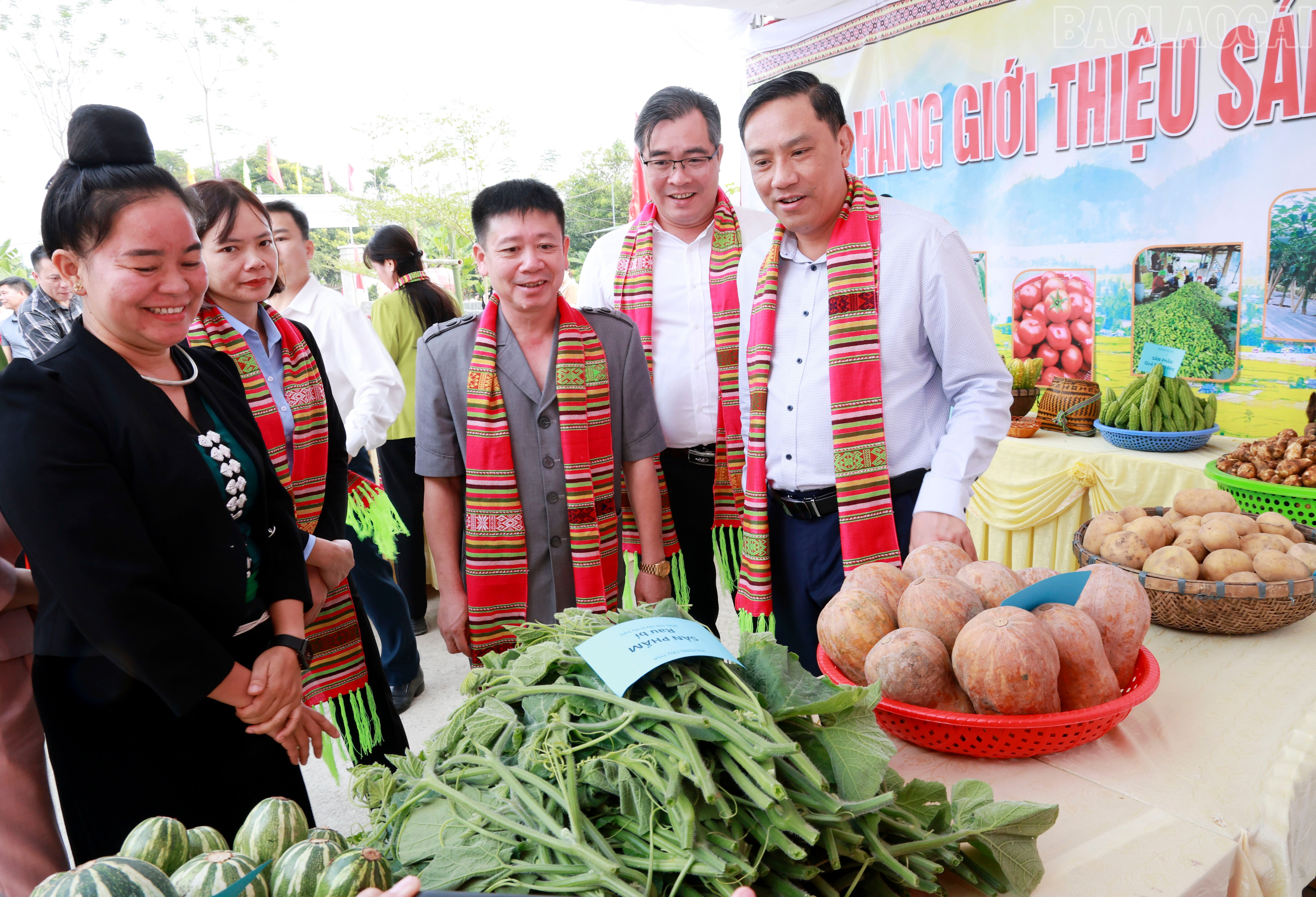 Đồng chí Hoàng Giang - Phó Bí thư Thường trực Tỉnh ủy tham quan mô hình trưng bày, giới thiệu nông sản của bà con tại buổi lễ.