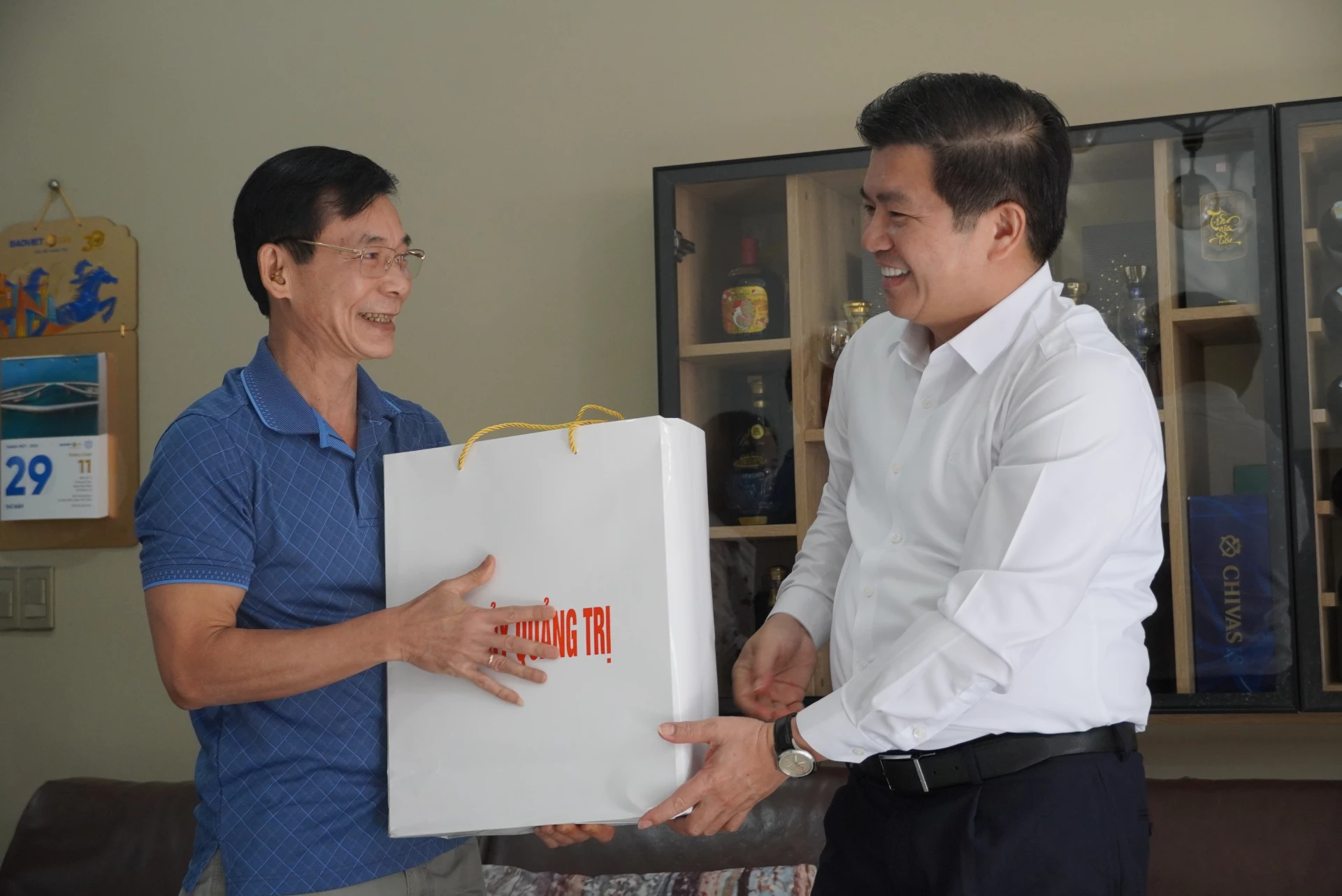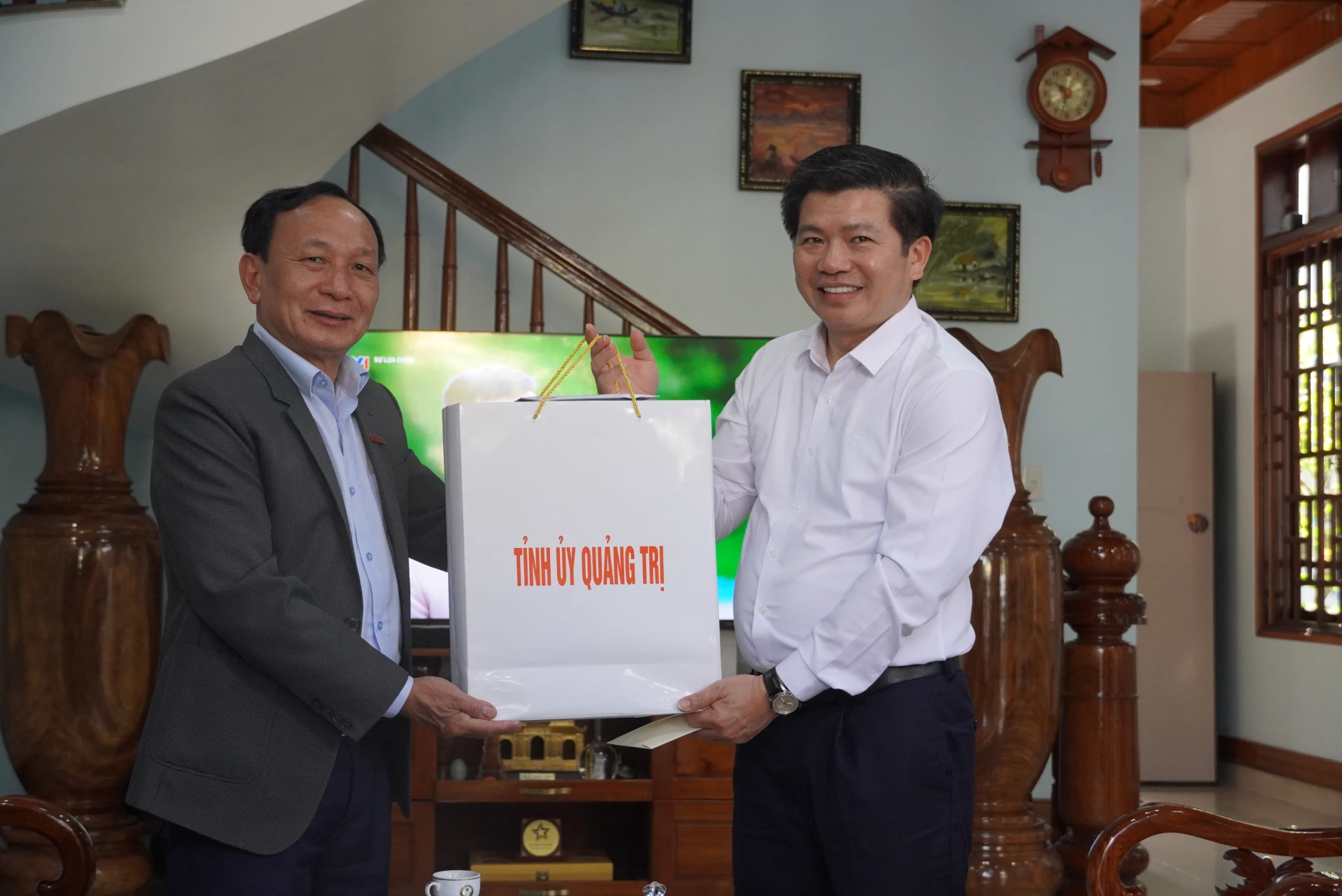 Đồng chí Phó Bí thư Thường trực Tỉnh ủy Trần Vũ Khiêm tặng quà chúc Tết đồng chí Trần Hải Châu, nguyên Phó Bí thư Thường trực Tỉnh ủy, Chủ tịch HĐND tỉnh - Ảnh: HL