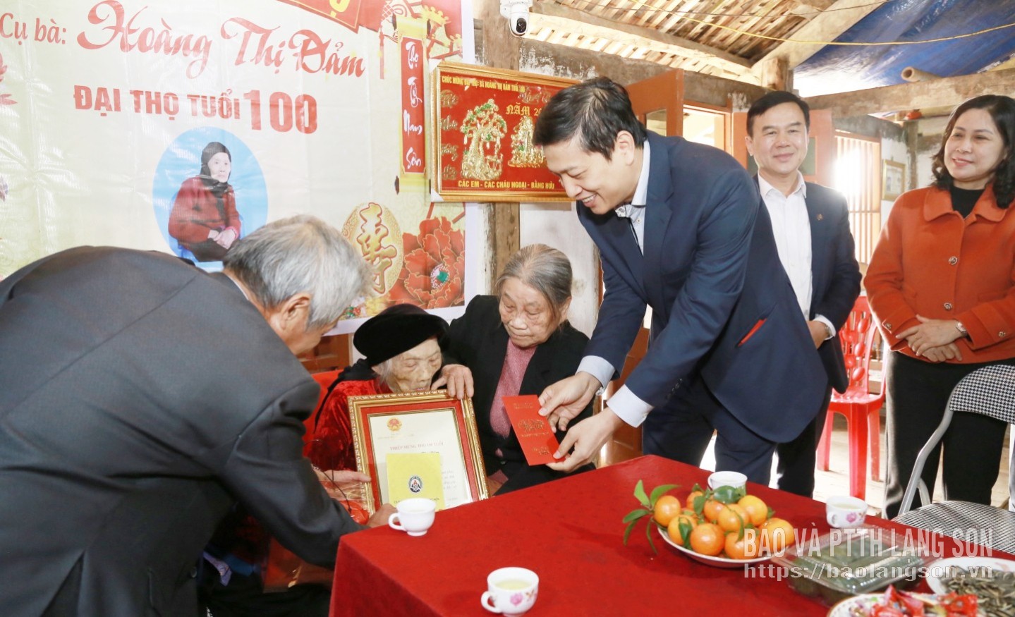 Đồng chí Phó Bí thư Tỉnh ủy đã trao thiếp mừng thọ 100 tuổi, 5m vải lụa đỏ của Chủ tịch nước và quà tặng cho cụ Hoàng Thị Đảm.