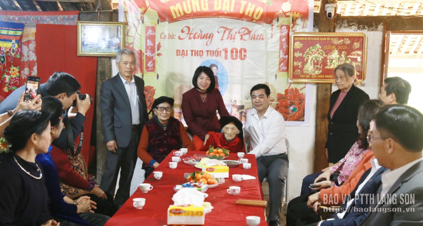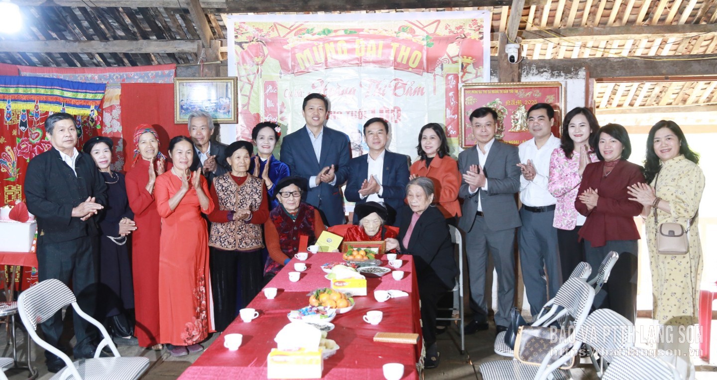 Tại đây, đồng chí Phó Bí thư Tỉnh ủy đã ân cần thăm hỏi sức khỏe cụ Hoàng Thị Đảm và toàn thể gia đình. Đồng chí chúc cụ sống vui, sống khỏe, sống trường thọ cùng con cháu, tiếp tục là chỗ dựa tinh thần cho con cháu, động viên gia đình, dòng họ, cộng đồng dân cư tích cực học tập, lao động sản xuất, góp phần xây dựng quê hương Lạng Sơn ngày càng giàu đẹp.