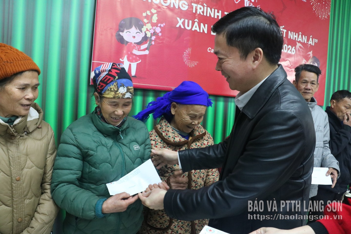 Đồng chí Phó Chủ tịch Thường trực UBND tỉnh và lãnh đạo Hội Chữ thập đỏ tỉnh trao quà cho các hộ có hoàn cảnh khó khăn tại xã Cao Lộc