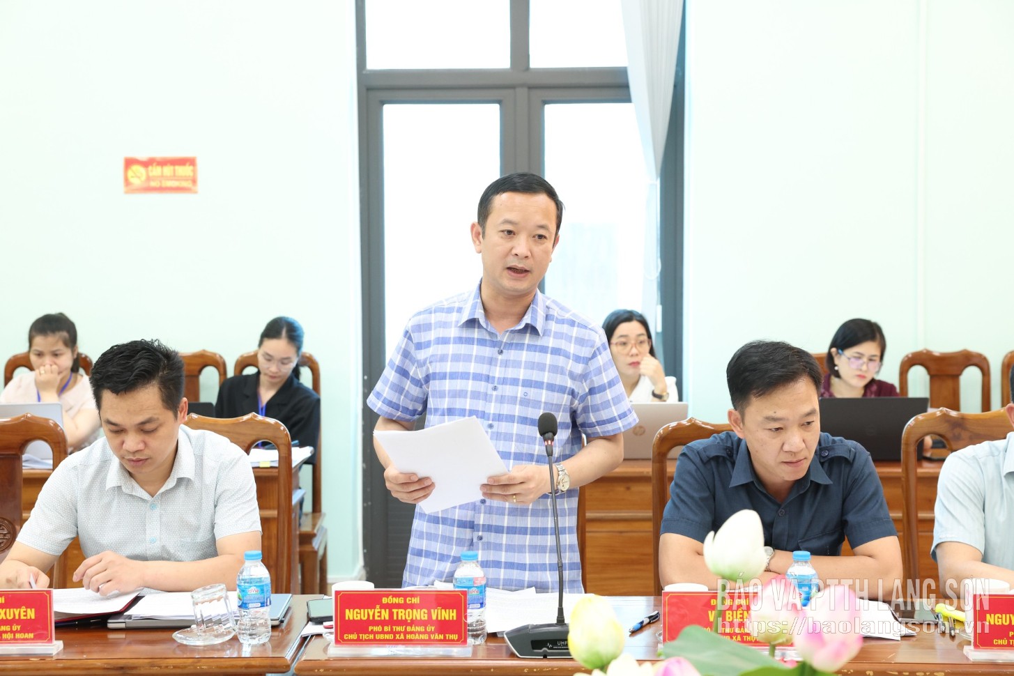 Lãnh đạo xã Hoàng Văn Thụ báo cáo một số nội dung tại buổi kiểm tra