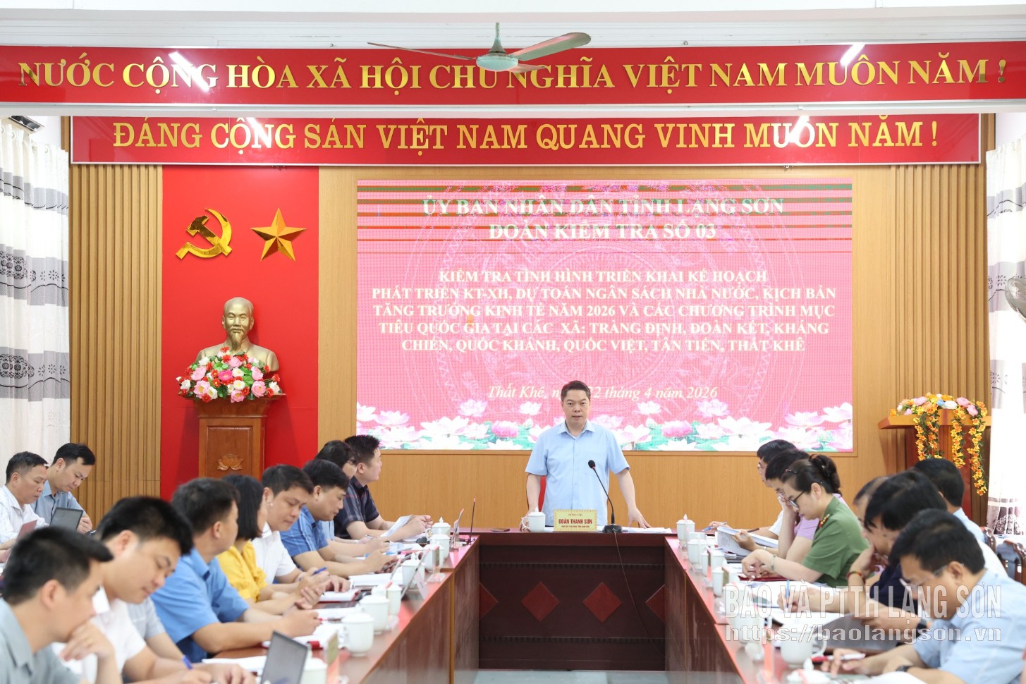 Đồng chí Đoàn Thanh Sơn, Phó Chủ tịch UBND tỉnh phát biểu kết luận tại buổi kiểm tra các xã: Tràng Định, Đoàn Kết, Kháng Chiến, Quốc Khánh, Quốc Việt, Tân Tiến, Thất Khê