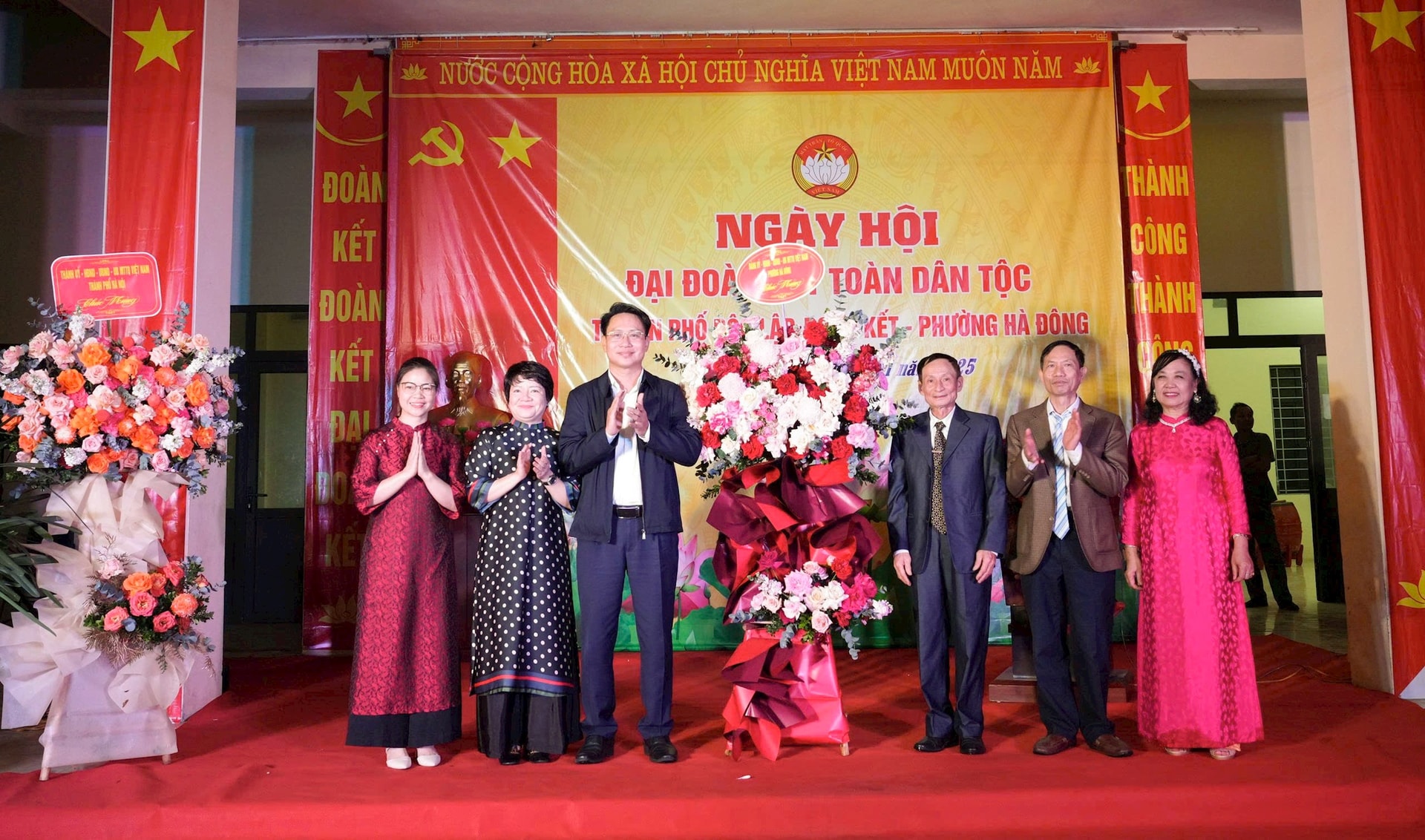 Lãnh đạo phường Hà Đông tặng hoa tổ dân phố nhân Ngày hội Đại đoàn kết toàn dân tộc. Ảnh: PV