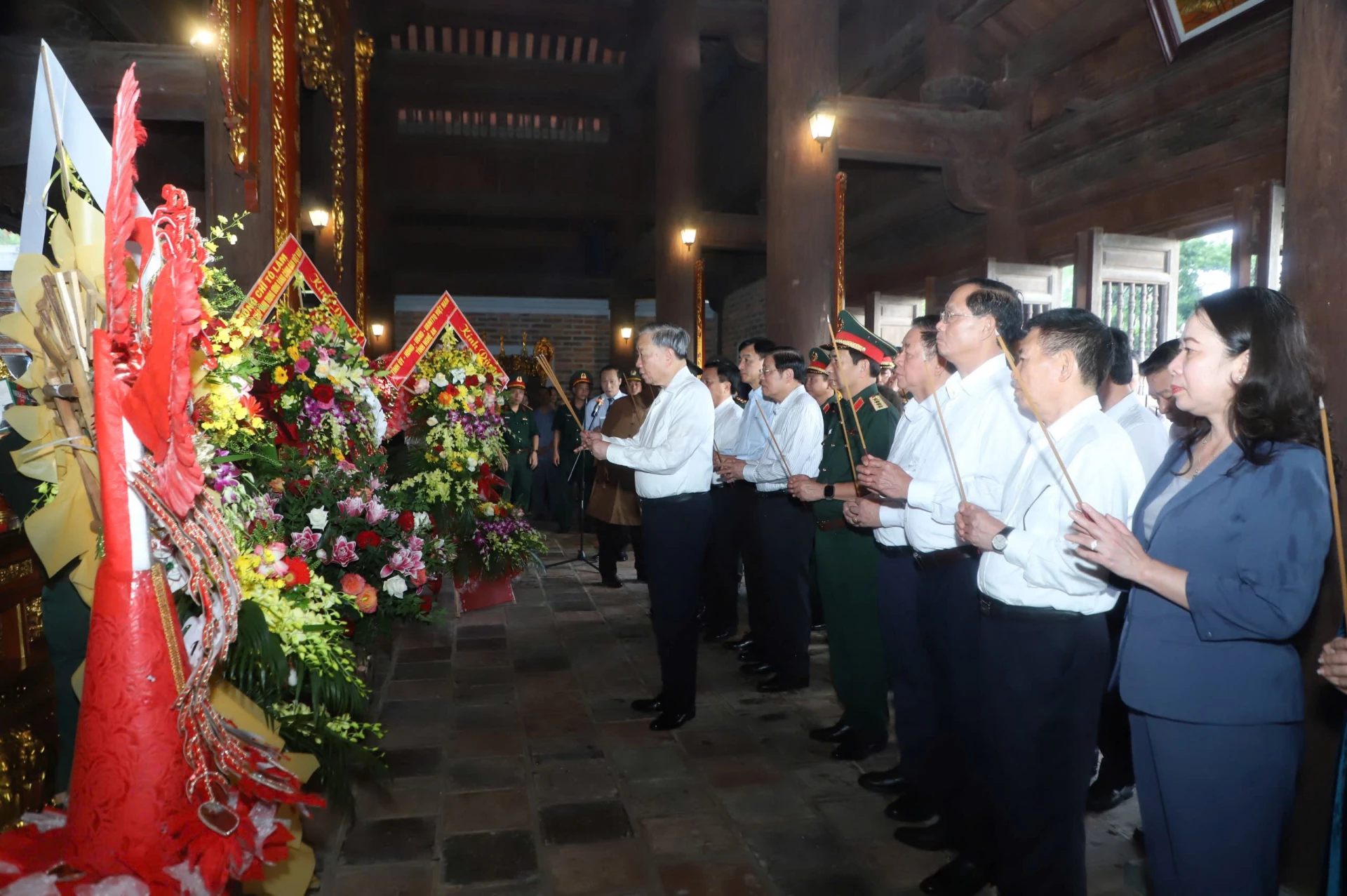 Đồng chí Tổng Bí thư Tô Lâm và đoàn đại biểu dâng hoa, dâng hương tại Đền Chung Sơn-Đền thờ gia tiên Chủ tịch Hồ Chí Minh - Ảnh: QV